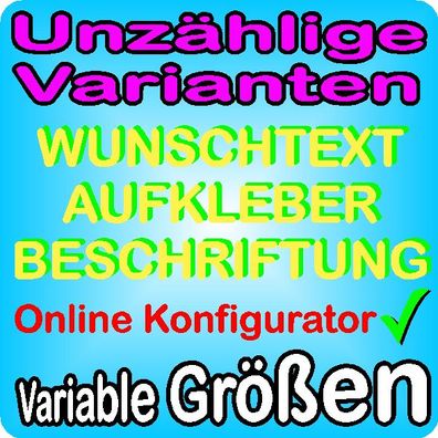 Individuelle Auswahl aus unzähligen Varianten im online Konfigurator - WUNSCHTEXT - MOTIV - AUFKLEBER HIER SELBST GESTALTEN Unzählige Auswahl an Varianten mit Vorschaufunktion! Wir sind Ihre Quelle für günstige Aufkleber und Beschriftungen nach Wunsch und Maß! Dieses Angebot gilt nur in Verbindung m
