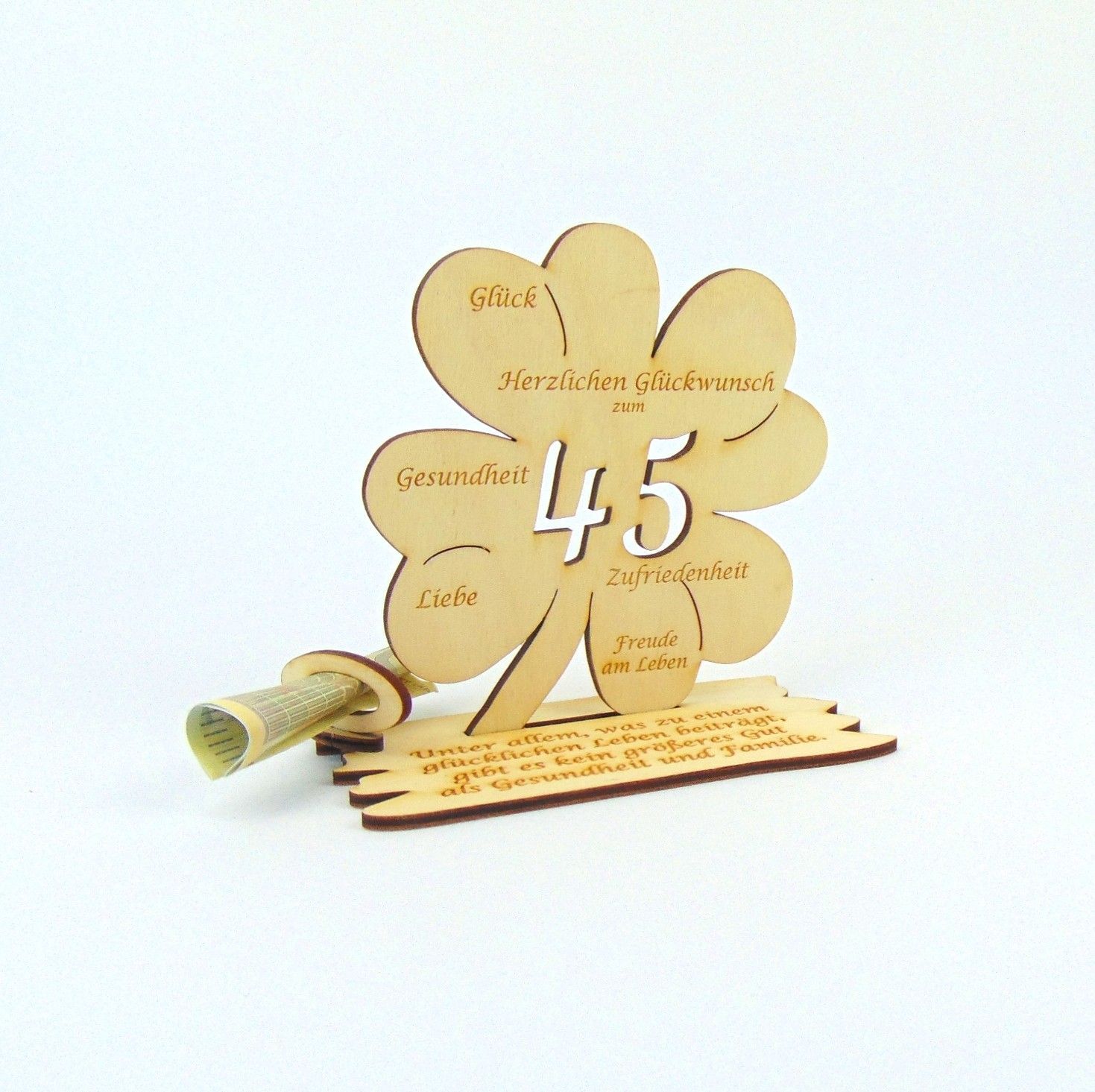 Geldgeschenk Kleeblatt zum Geburtstag, zum Hochzeitstag oder für andere Jubiläen, mit oder ohne Namensgravur, bestehend aus einer Zackenplatte, einem Kleeblatt mit aus gelaserter Jahreszahl, gravierten Glückwünschen sowie einem Geldscheinhalter. Größe Kleeblatt:11 cm, Größe Zackenplatte: 12,9cm breit und 6cm tief Material: Birkenholz, 3 mm Farbe: Natur