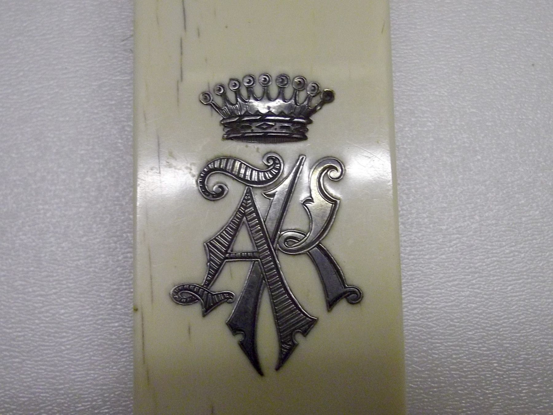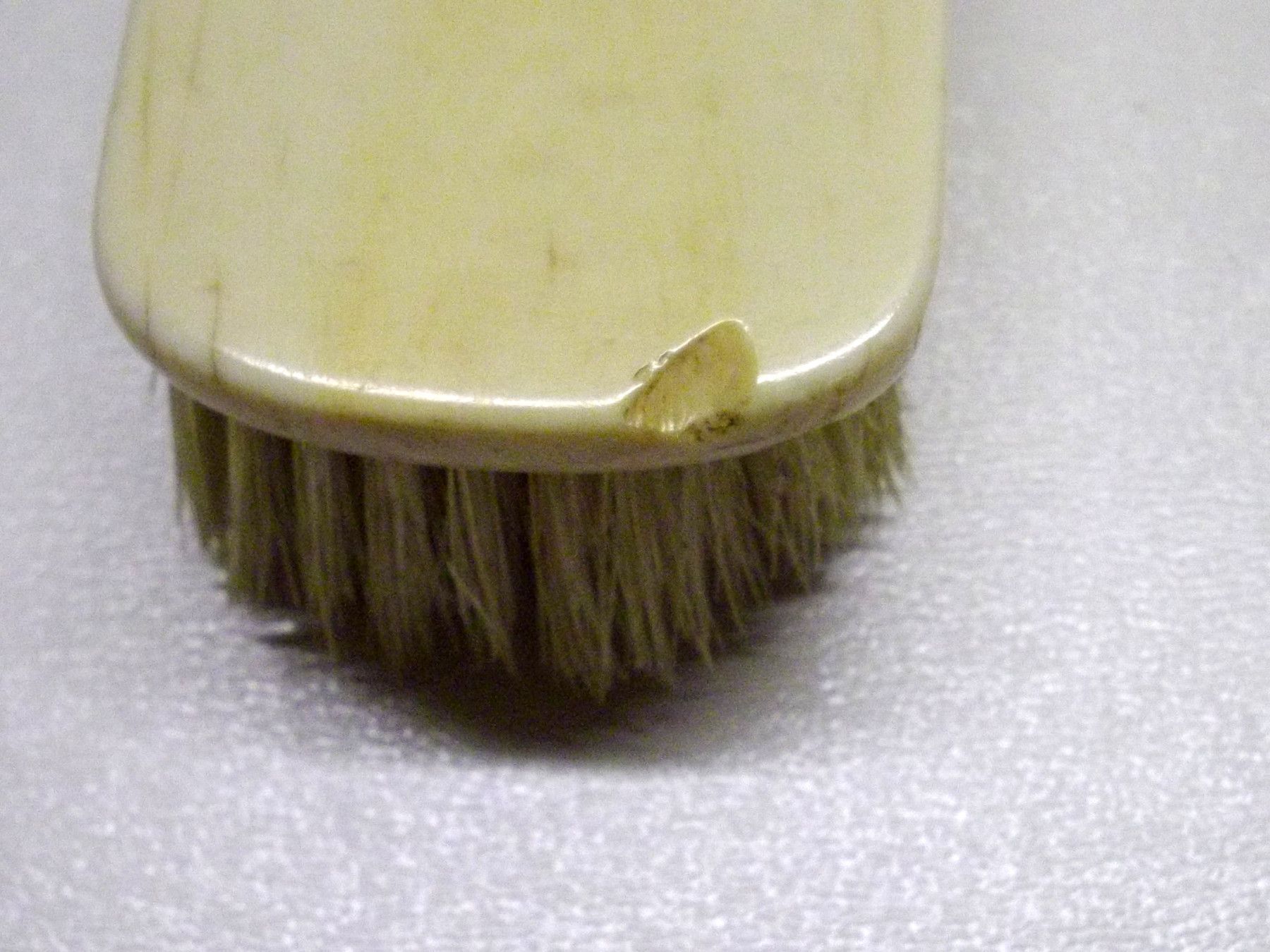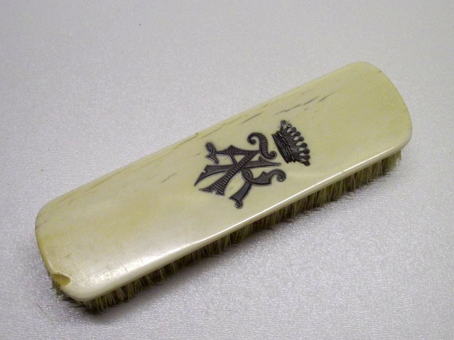 Fürstliche Kleider-Bürste aus Bein und Silber, um1850. Mit den silbernen Initialen AK. Die Borsten sind noch recht gut erhalten, kleiner Ausbruch an einem Ende der Bürste. Maße: L 16,5, B 4,5, H 3,2 cm. Antikes am Deich - Inh: Oliver Kipp-Trense