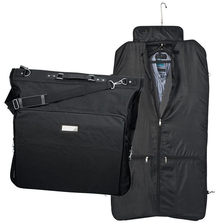 Kleidersack großer strapazierfähiger Kleidersack aus festem Polyester mit Schulterriemen, Tragegriff, zusätzlichen Staufächern und dezentem Metallschild auf einem Label aus Kunstleder Farbe: schwarz