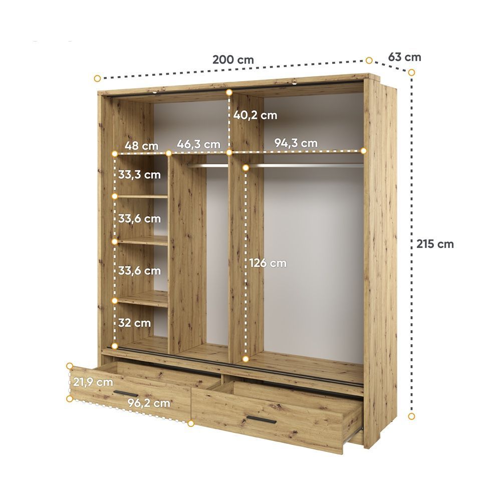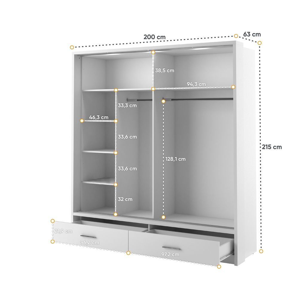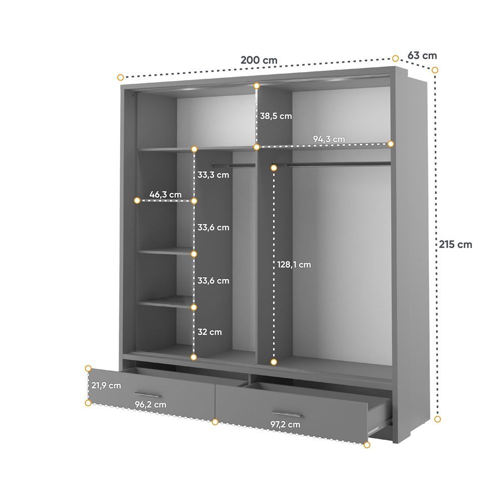 Kleiderschrank A-05, Schwebetürenschrank mit Spiegel, Schubladen , LED. Breite 200cm