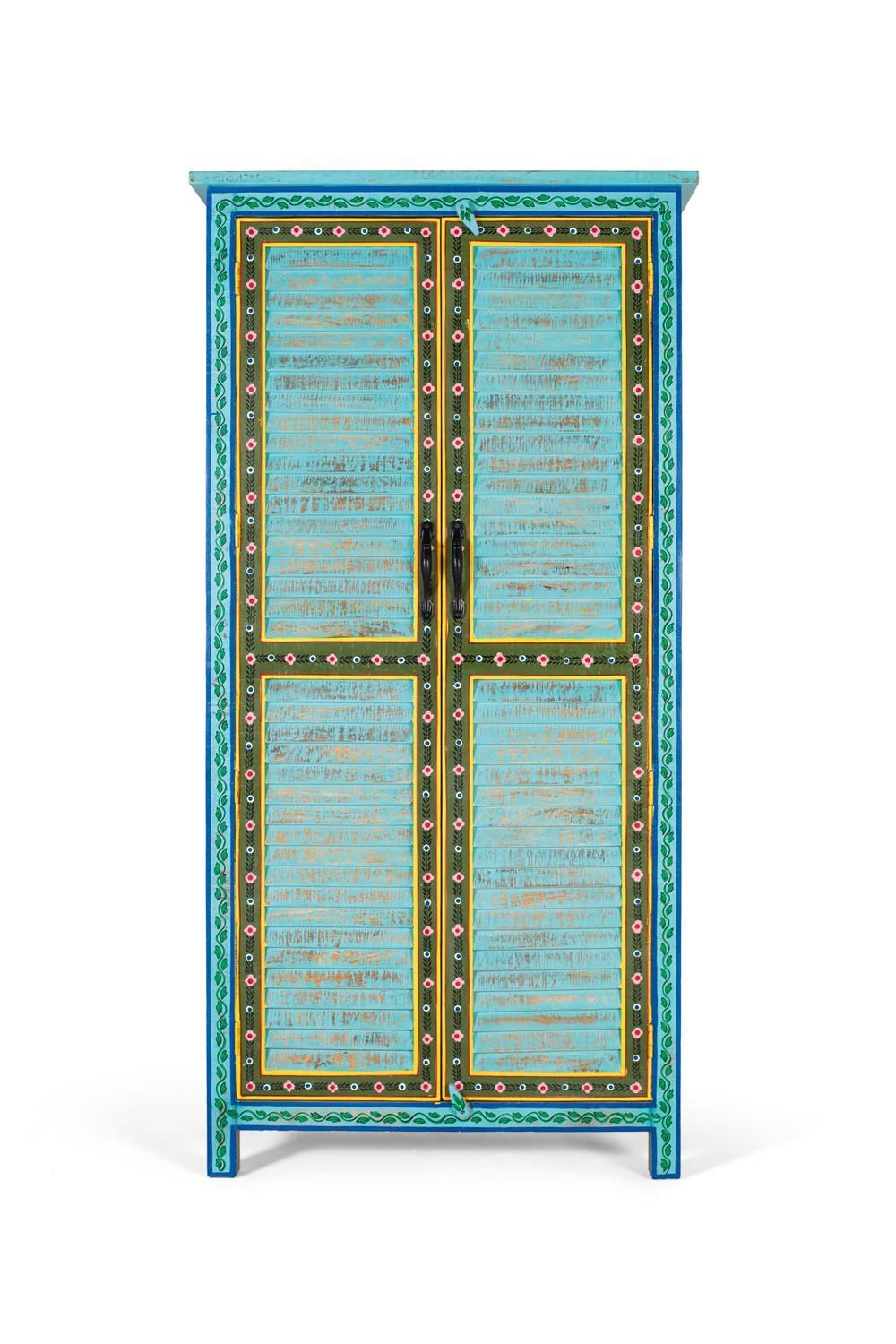 Dieser Kleiderschrank ist ein einzigartiges Möbelstéck, gefertigt aus Mangoholz. Es wurde in einem leuchtenden Blauton handbemalt und die filigrane Handwerkskunst unterstreicht seinen Charme. Die Téren sind im mallorquinischen Stil gestaltet und zeichnen sich durch horizontal angeordnete Holzlamelle