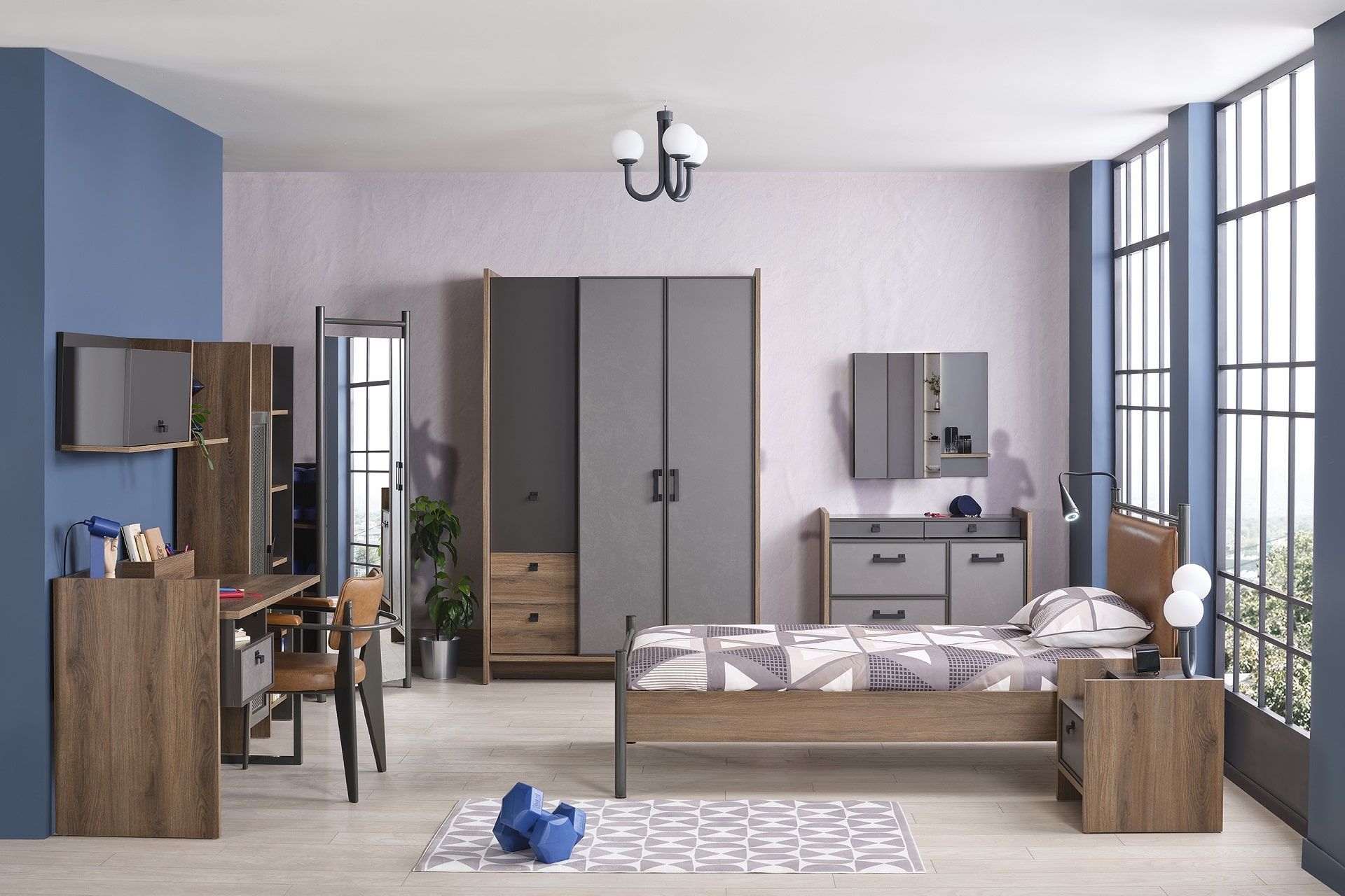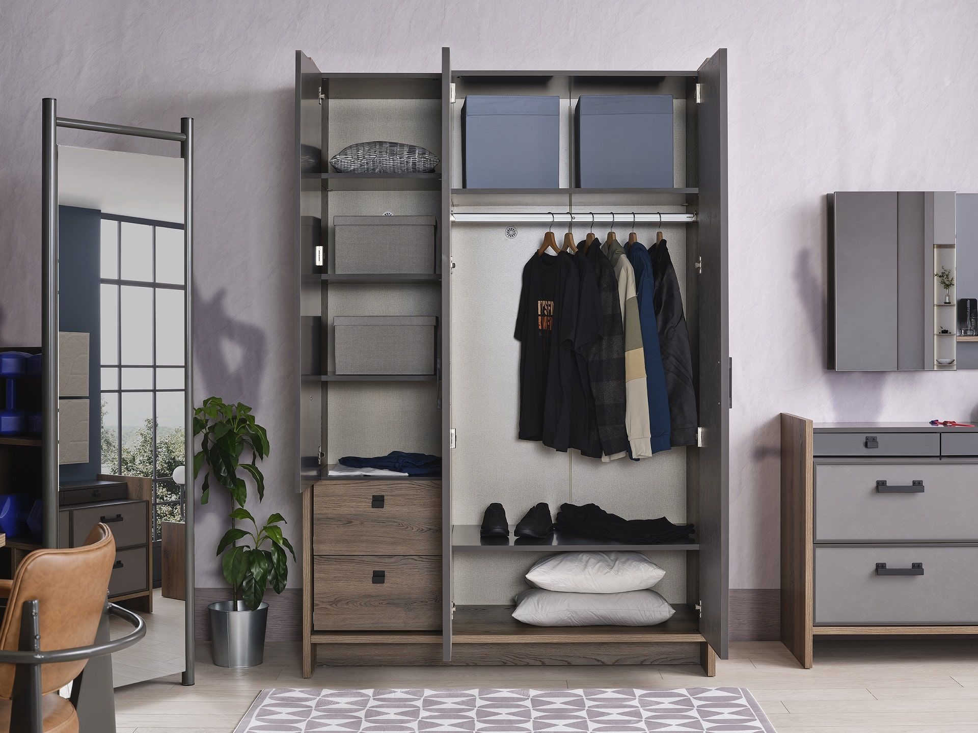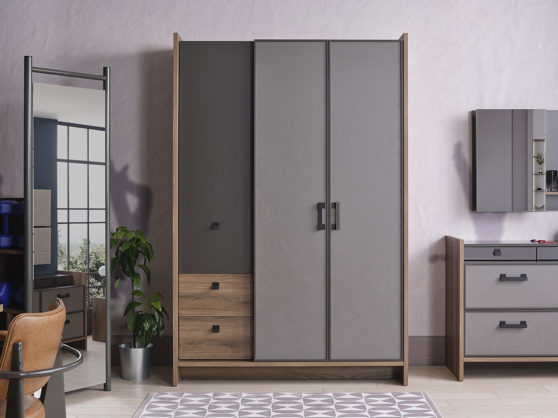 Kleiderschrank Craft 3-Türig in Anthrazit/Silbergrau/Holzoptik
