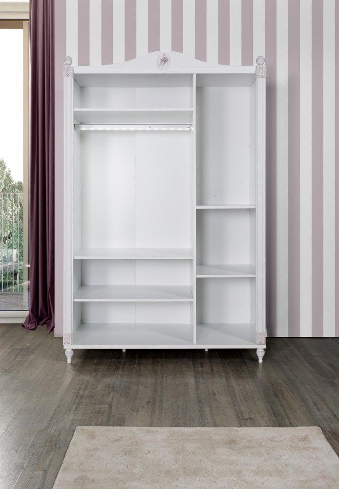 Kleiderschrank Goldi mit romantischen Verzierungen 3-türig GOL-KL Im Angebot enthalten: 1x Kleiderschrank Goldi Material: Spanplatte mit romantischen Verzierungen 3x Türe 5x Einlegeboden 1x Kleiderstange mit LED Beleuchtung B H T: ca. 140x215x62 cm Optional erhältlich: Jedes Element einzeln erhältli