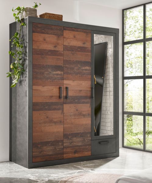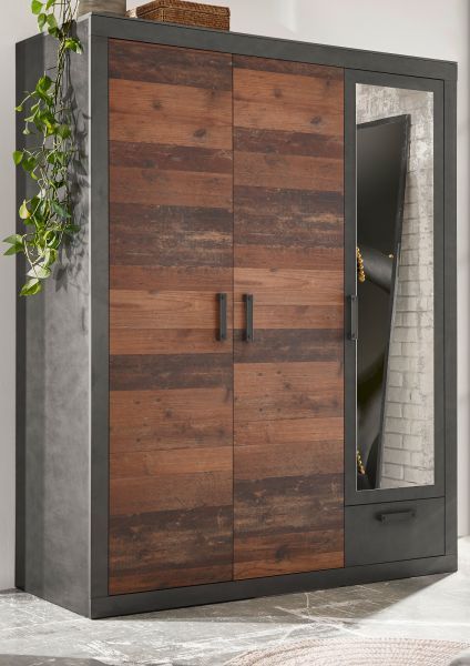 Kleiderschrank in Used Wood und grau Drehtüren Schrank Schubkasten Spiegel Ward