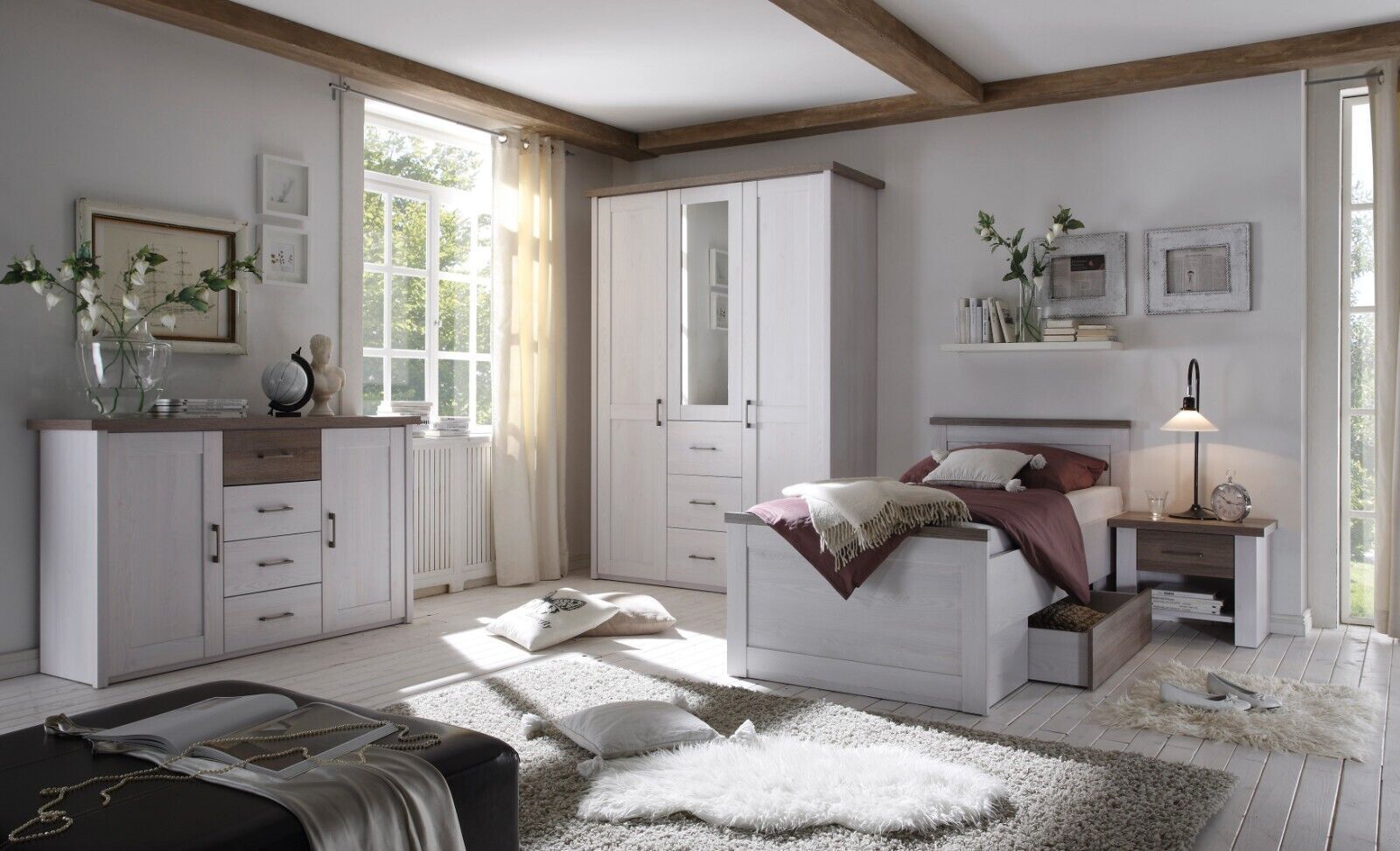 Schlafzimmer Set 3-tlg Bett 90 cm Kleiderschrank und Nachttisch weiß Landhaus Stove