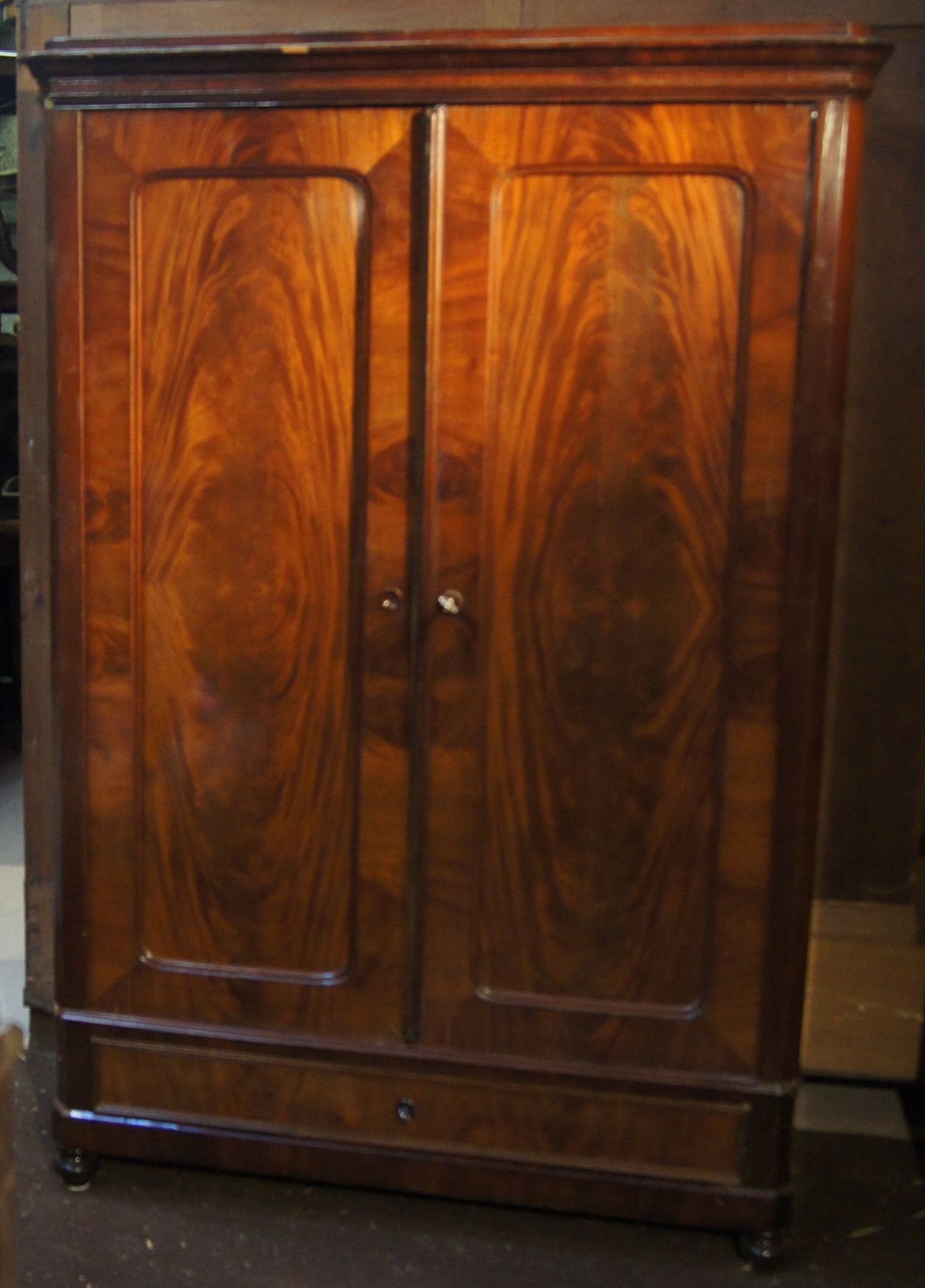 Kleider-Schrank um 1830 (Biedermeier). 2-türig . Material: Mahagoni. Mit Schublade unten. Zerlegbar. Kleine Furnierschäden (siehe Fotos). Maße: H 180, B 124, T 56, Innentiefe 45 cm. Lieferung im Umkreis von 40 km frei Haus! Sonst Transport mit Spedition möglich (je nach Angebot und Entfernung!). Der
