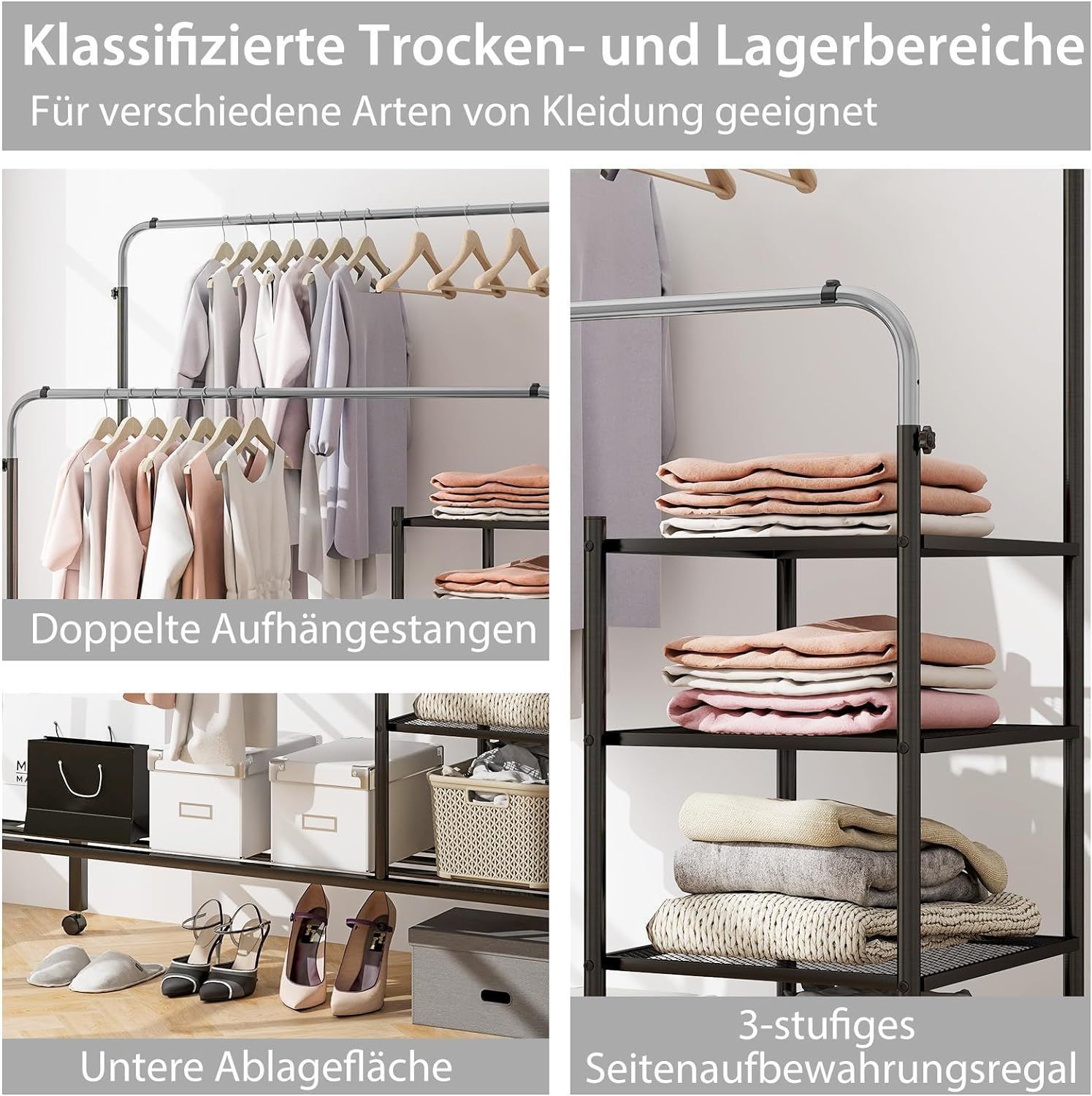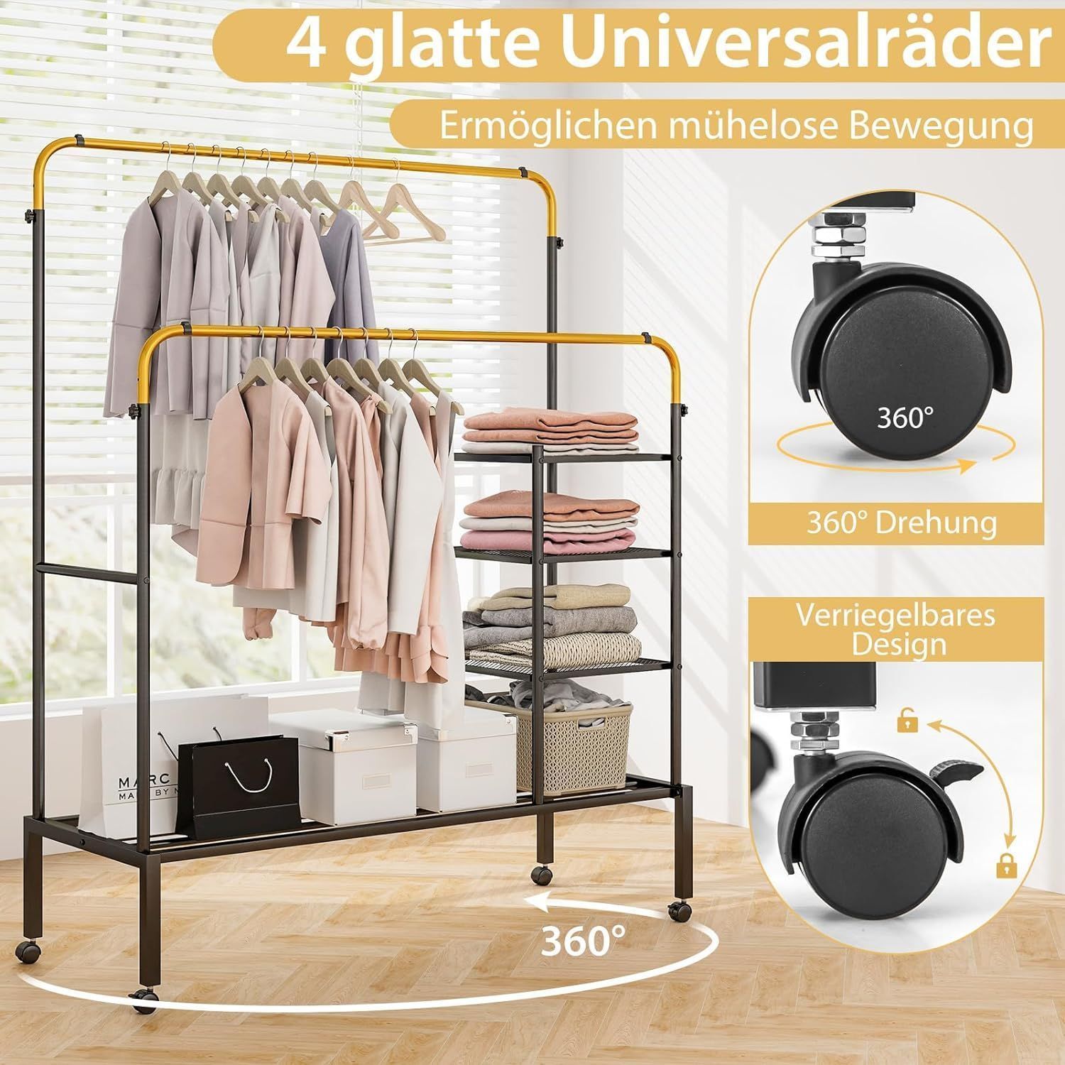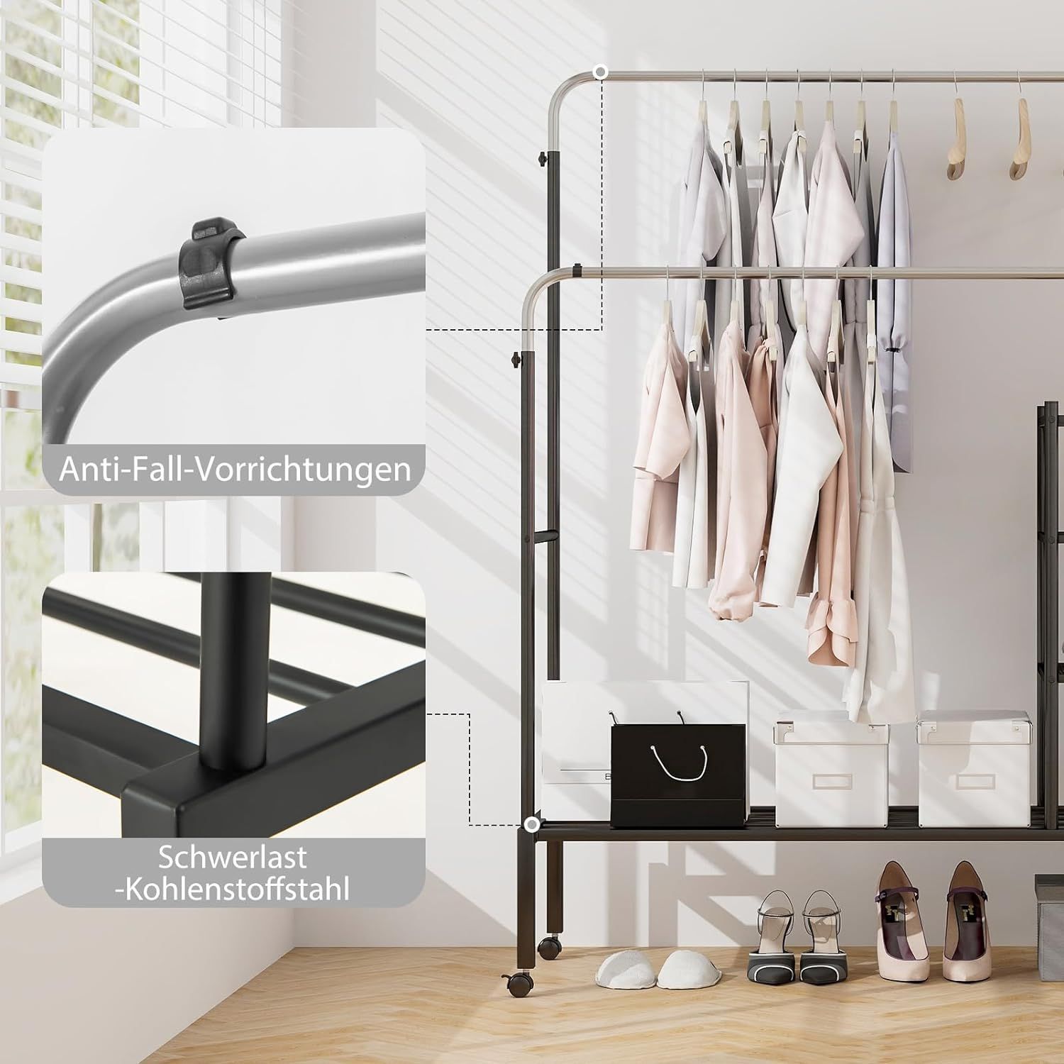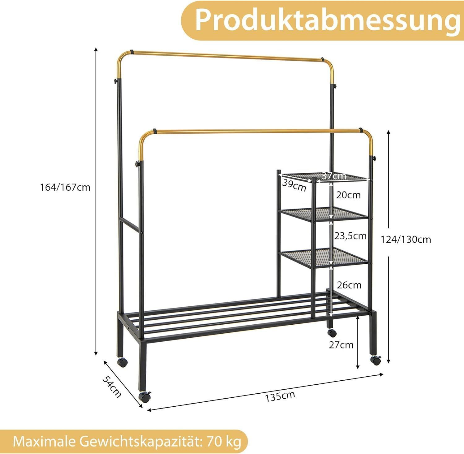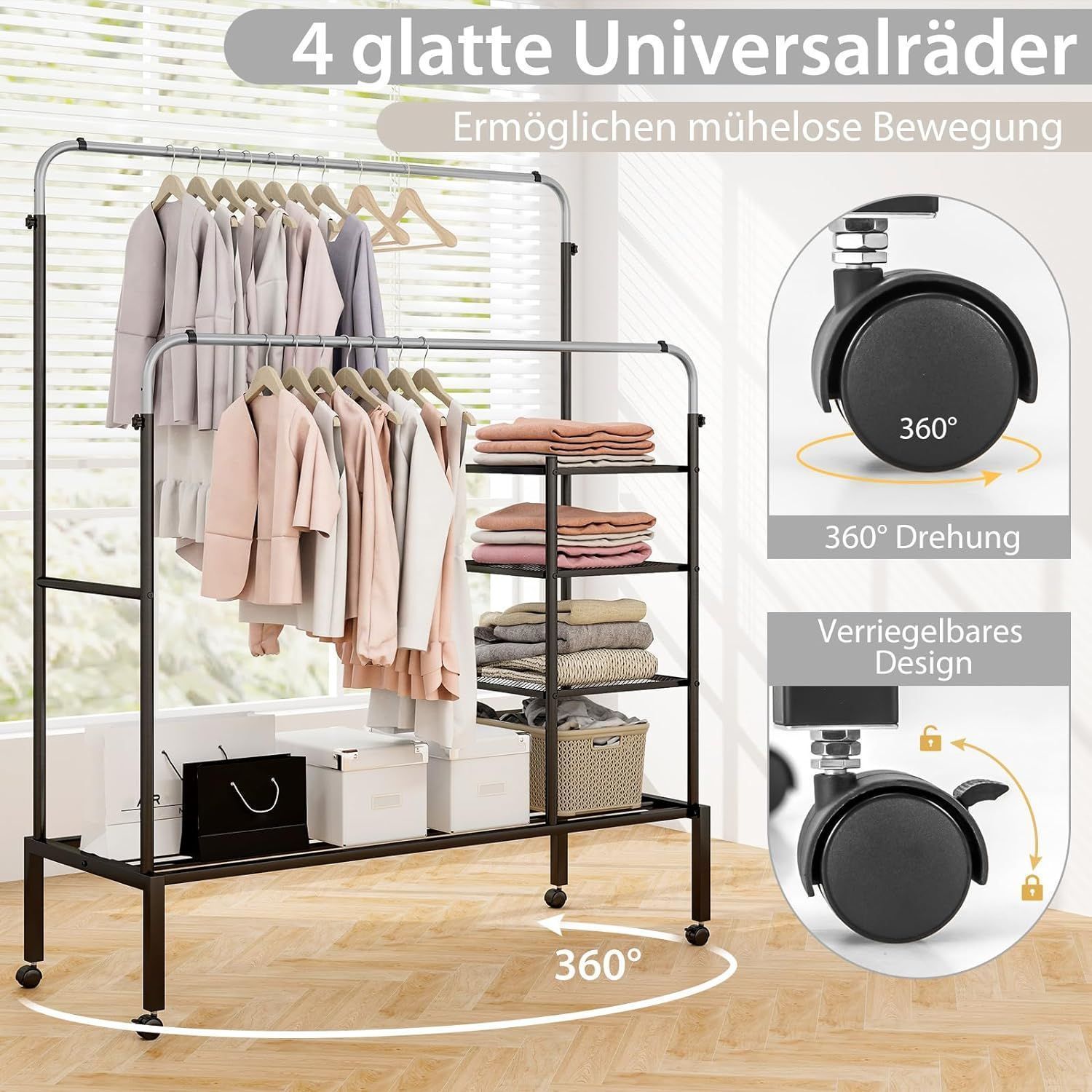 Kleiderständer mit 2 Kleiderstangen, Wäscheständer auf Rollen, Garderobenständer