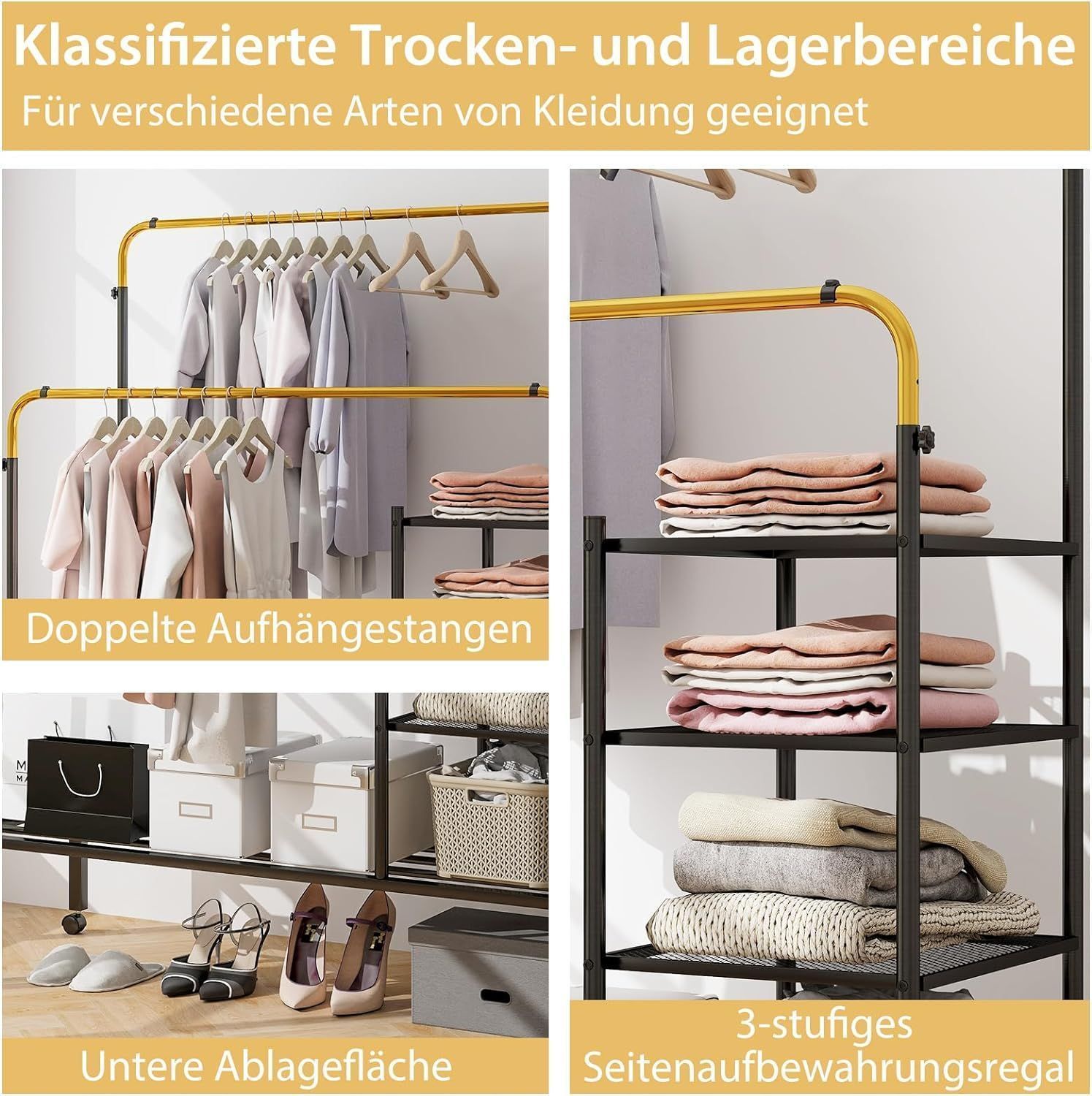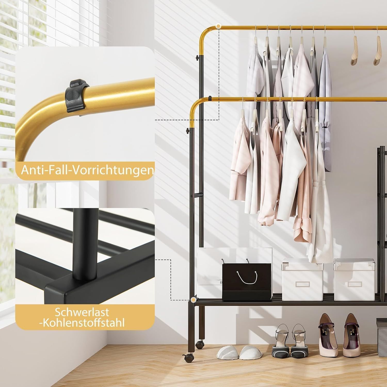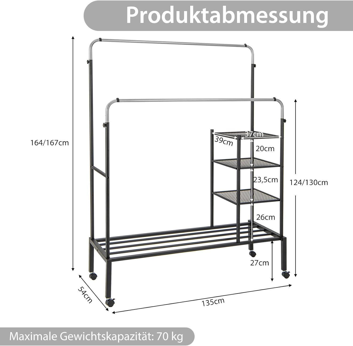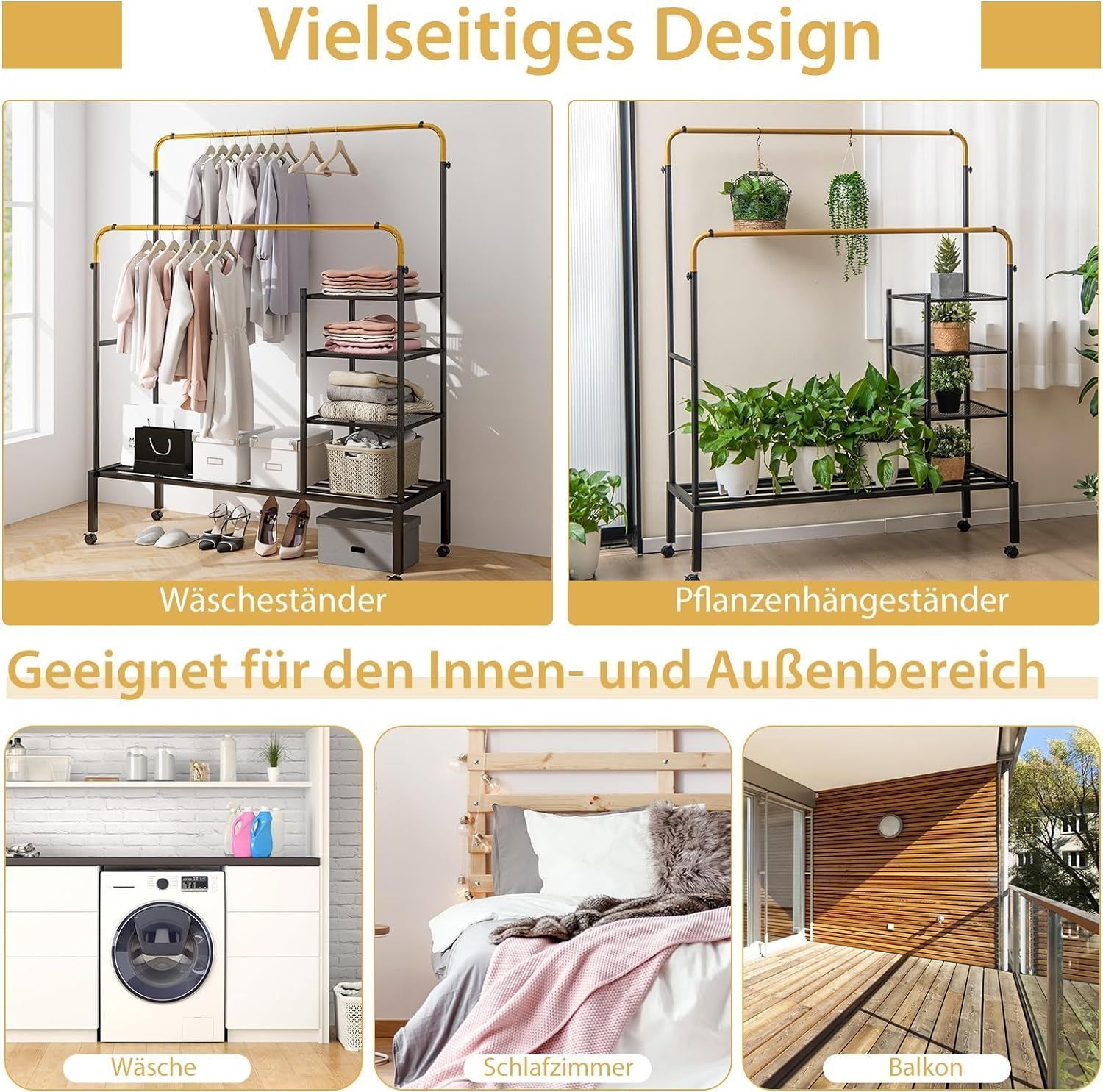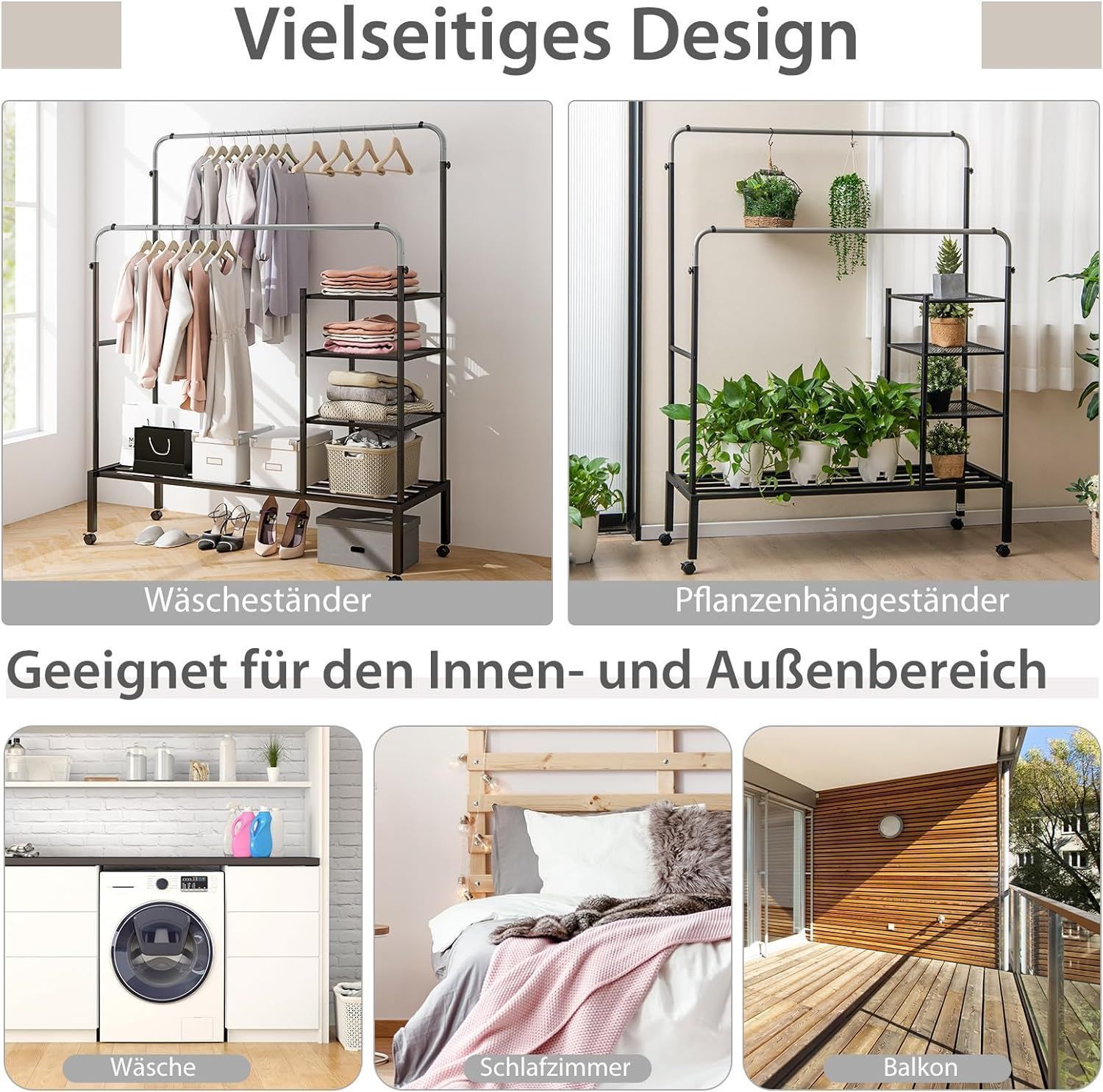 Kleiderständer mit 2 Kleiderstangen, Wäscheständer auf Rollen, Garderobenständer