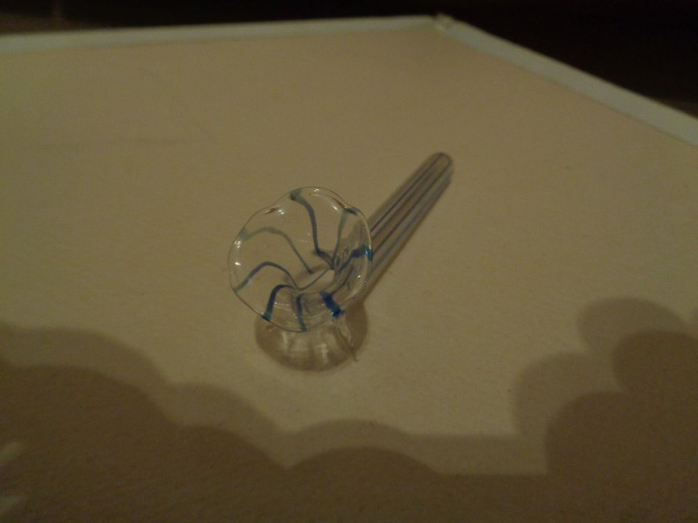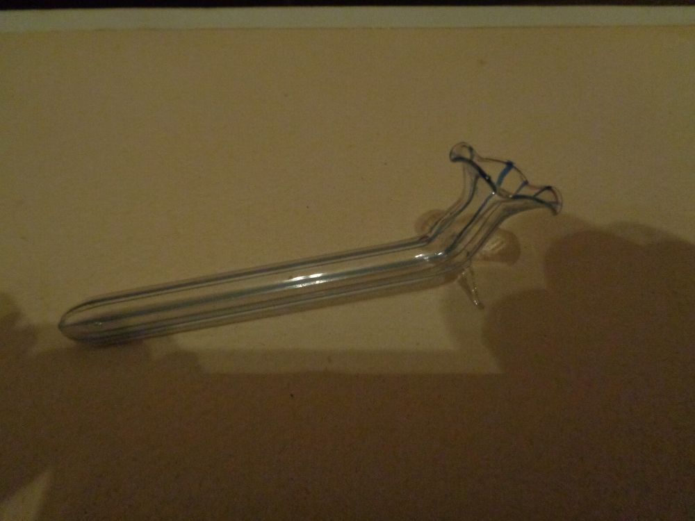 kleine ältere Tischvase aus Lauscha Glas mit blauen Streifen
