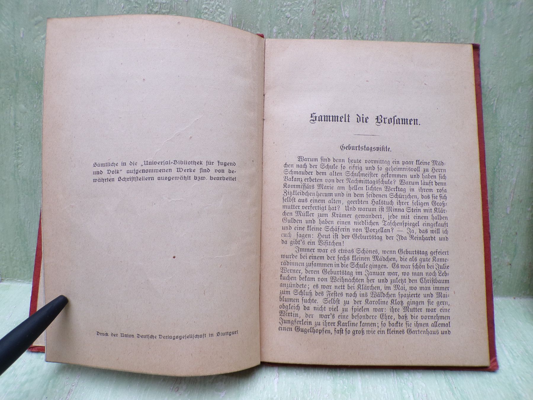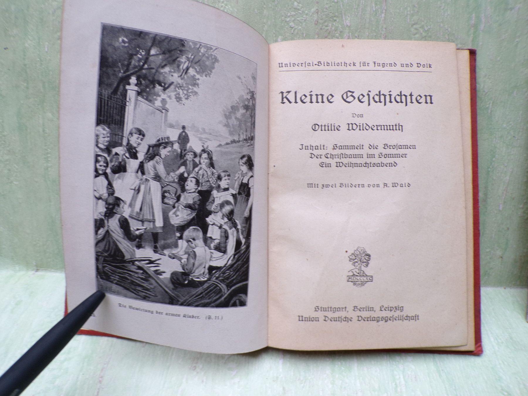 ... Erinnerungen ..... . . Kleine Geschichten . von Ottilie Wildermuth Inhalt : Sammelt die Brosamen Der Christbaum im Sommer Ein Weihnachtsabend mit 2 Bildern von A. Wald 1890 Stuttgart - Berlin - Leipzig Union Deutsche Verlagsgesellschaft Universial-Bibliothek für Jugend und Volk Band 15 Preis 1 M