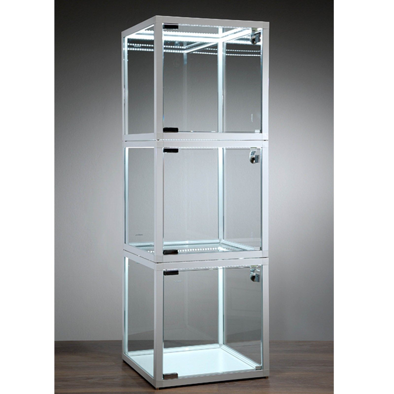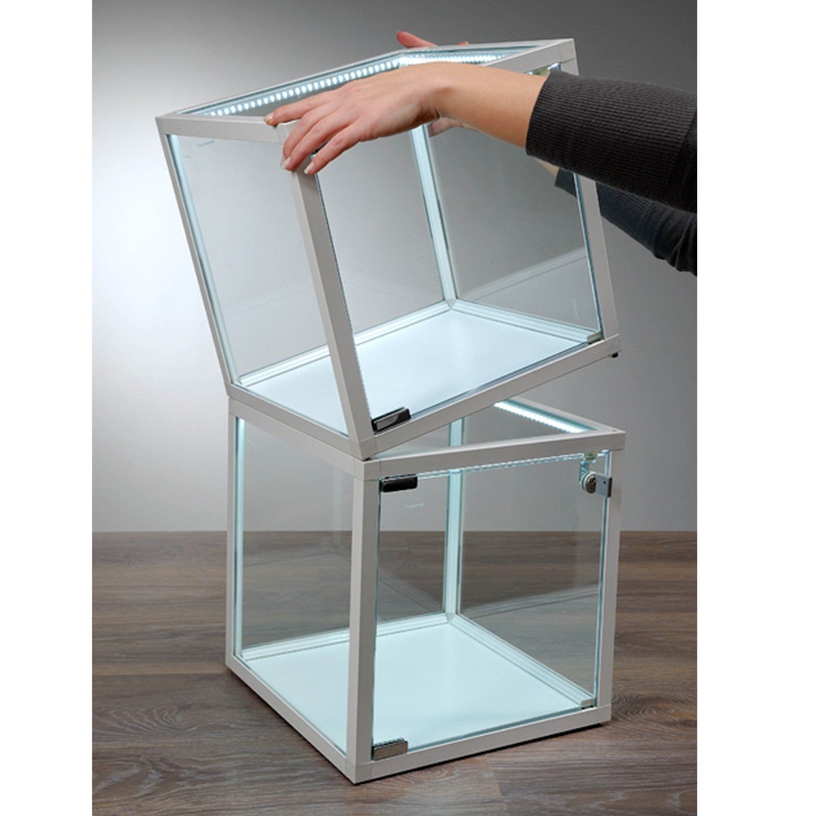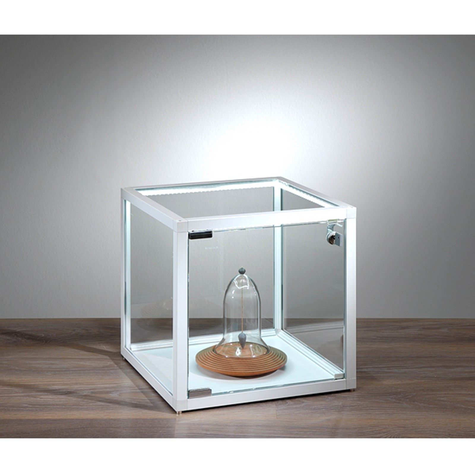 kleine quadratische Tisch Präsentationsvitrine beleuchtet & Schloss 42 cm weiß