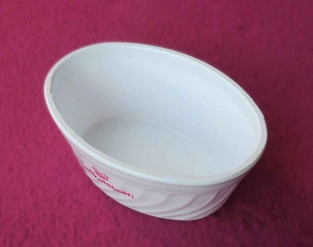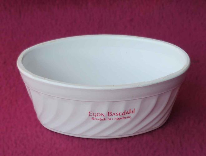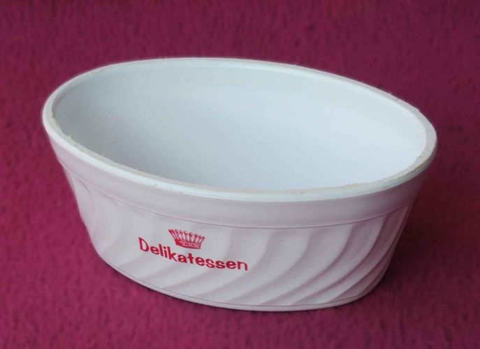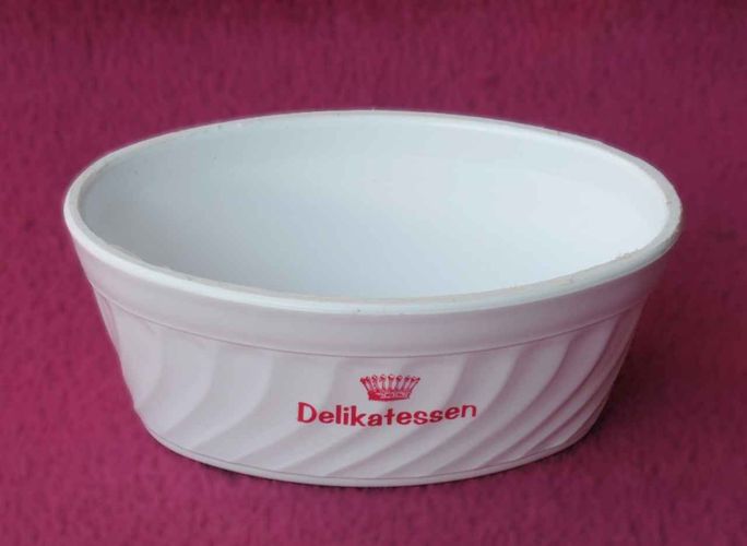 kleine Servierschale Sorel Plastiques mit Aufschrift Delikatessen und Egon Basedahl - Reinbek bei Hamburg Farbe: weiß, außen geriffelt Material: Kunststoff Größe: ca. 12 cm x 9 cm x 5 cm gebraucht Privatverkauf - keine Rückgabe, Umtausch oder Erstattung!