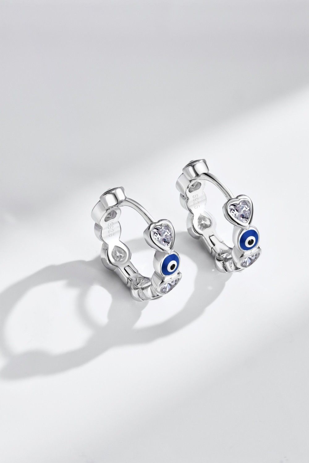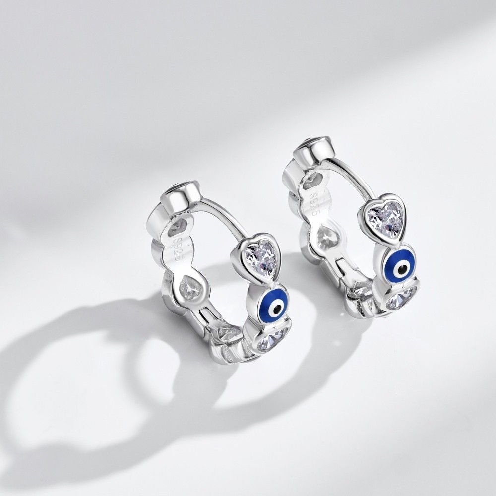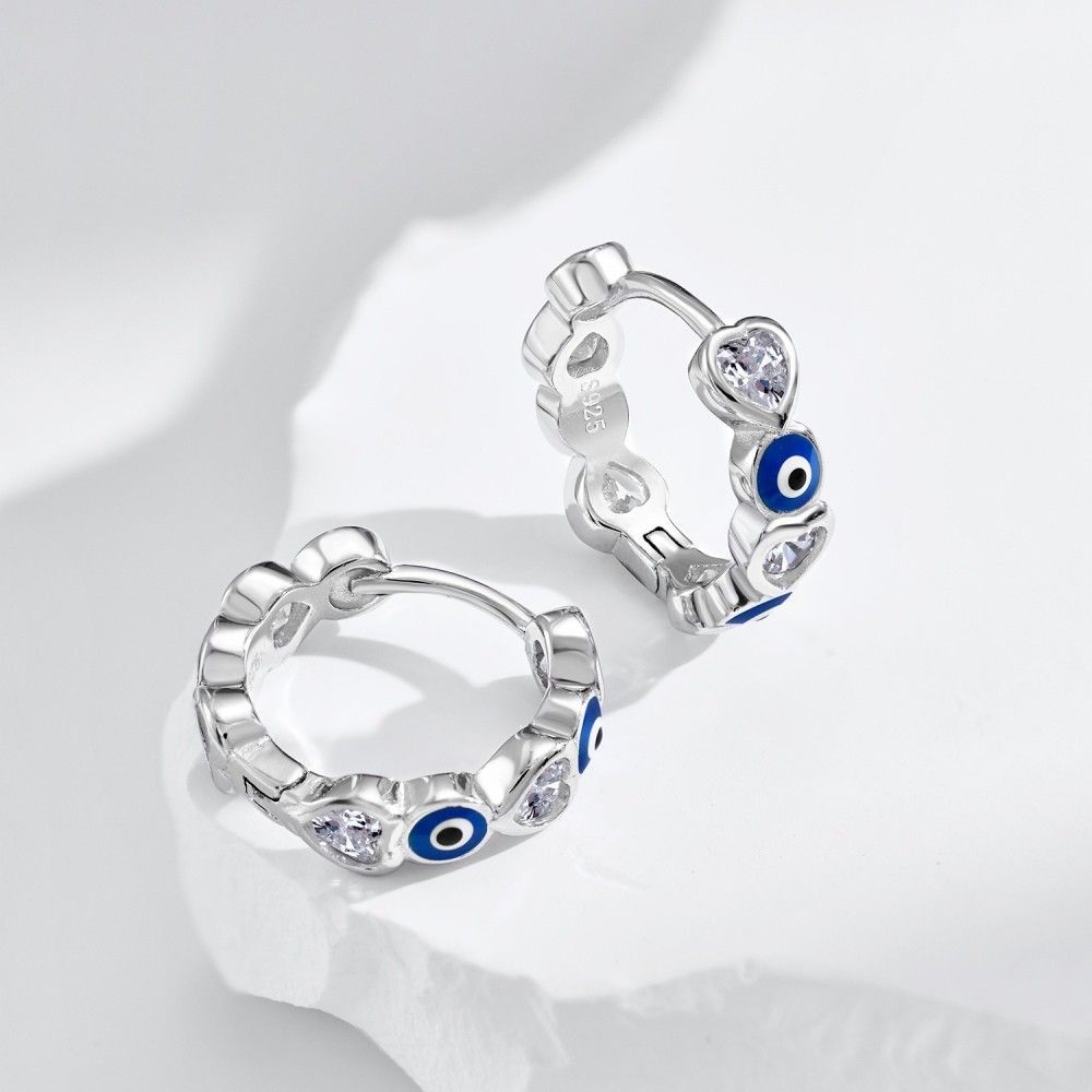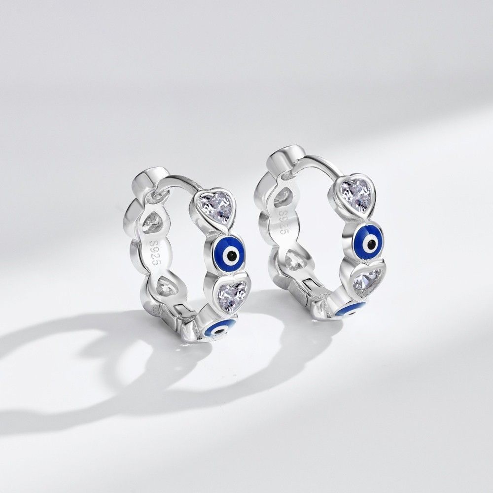Kleine Silberne Creolen mit dem Bösen Blick (Evil Eye) - Diese Ohrringe sind Creolen mit dem Bösen Blick (Evil Eye), oft auch Nazar-Auge genannt, kombiniert mit kleinen Herzen und Zirkonia-Kristallen. Sie sind aus 925er Sterlingsilber gefertigt oder plattiert und weisen abwechselnd blaue Emaille-Aug