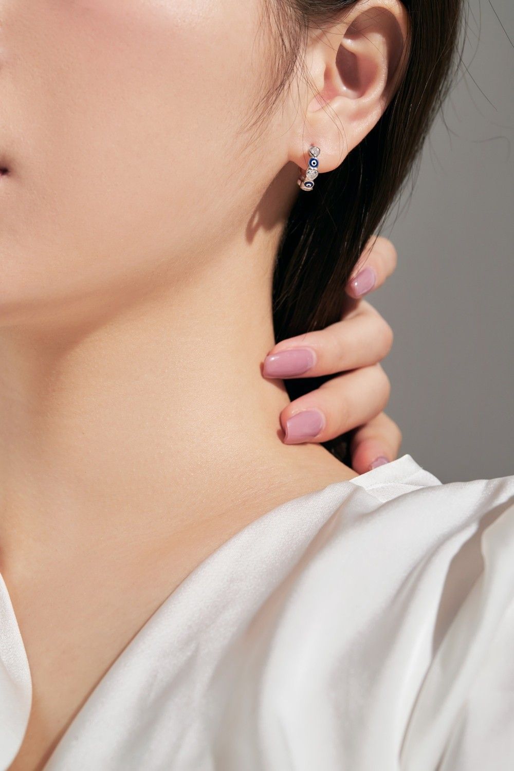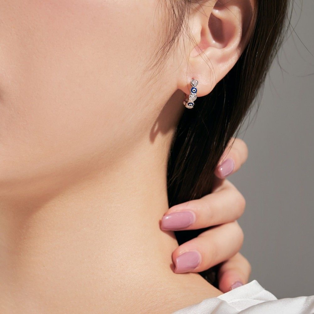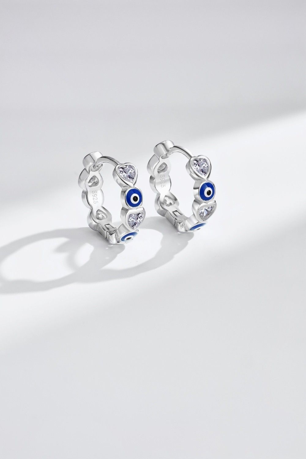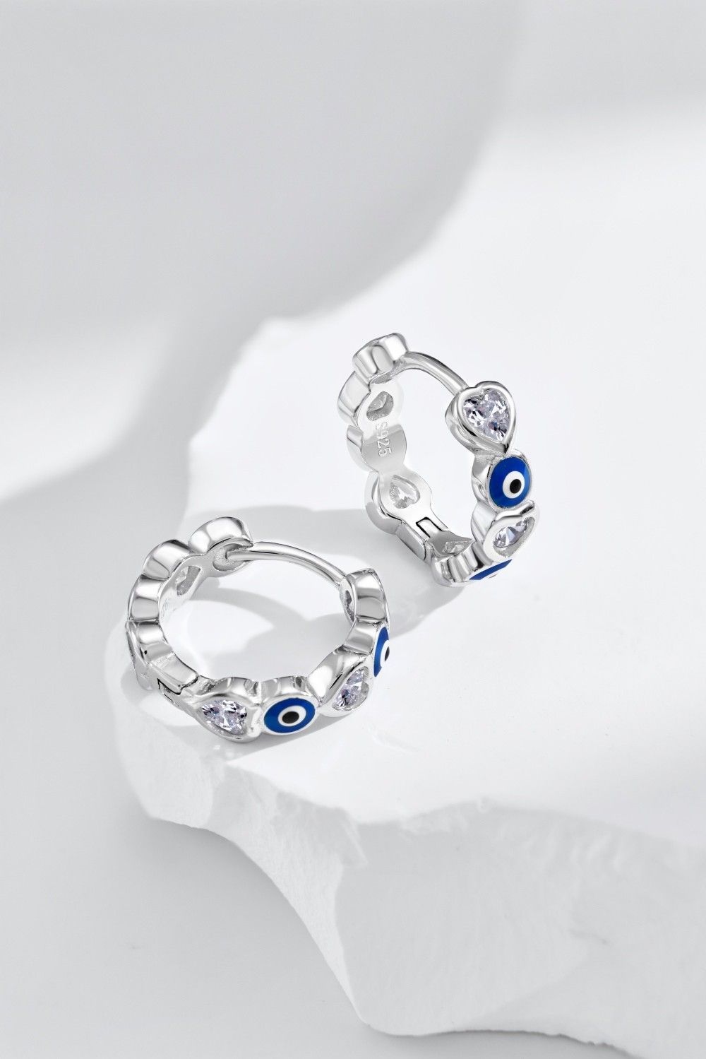 Kleine Silberne Creolen mit dem Bösen Blick (Evil Eye) - Diese Ohrringe sind Creolen mit dem Bösen Blick (Evil Eye), oft auch Nazar-Auge genannt, kombiniert mit kleinen Herzen und Zirkonia-Kristallen. Sie sind aus 925er Sterlingsilber gefertigt oder plattiert und weisen abwechselnd blaue Emaille-Aug