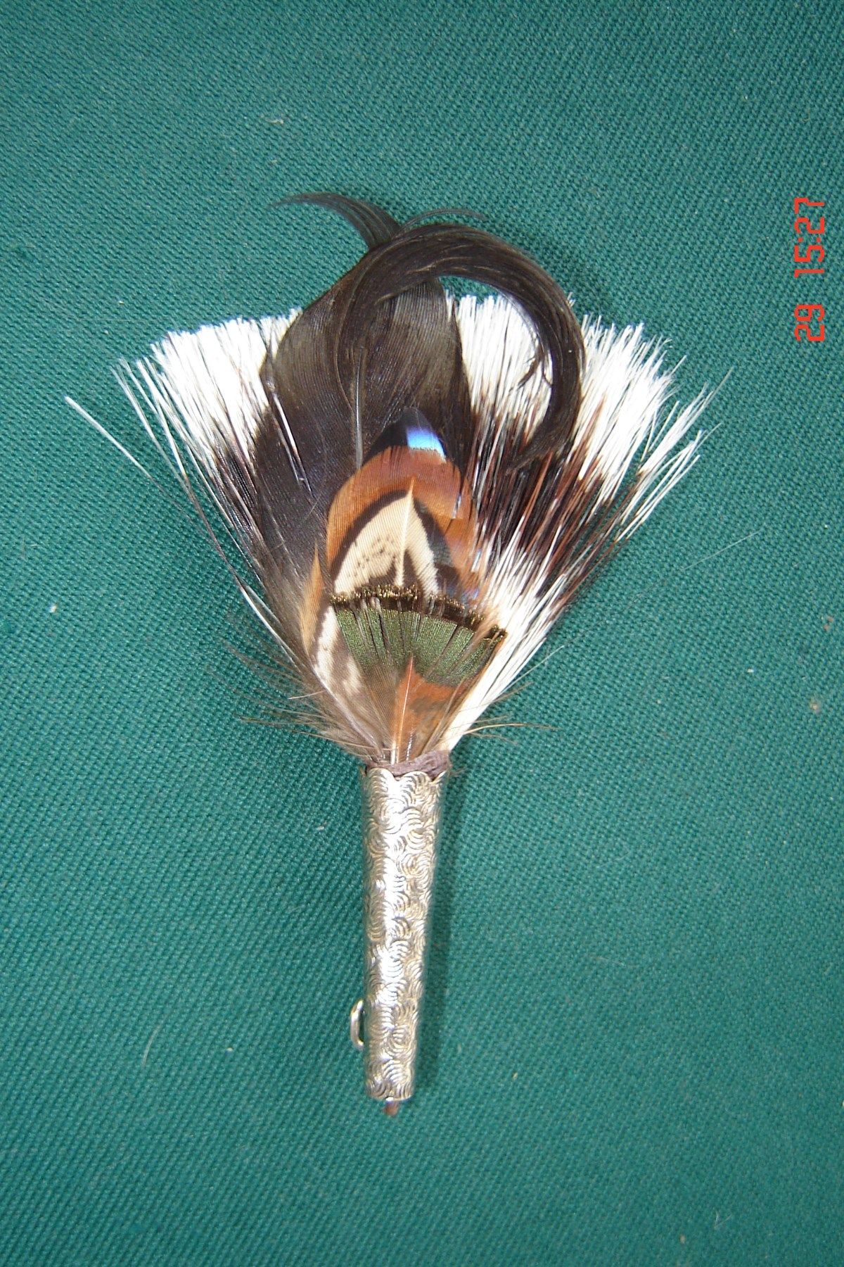 . Hutschmuck , Hutfeder die Geschenkidee für den Hutträger klassischer Hutschmuck für Trachtenhut Vereinshut , Schützenhut oder auch für den Wanderhut kleines Bärtchen , wie Dachsbärtchen mit bunter Feder und Hülse filigraner Halter mit Nadel zum Anstecken Gesamthöhe insgesamt ca 9 cm Natürlich werd