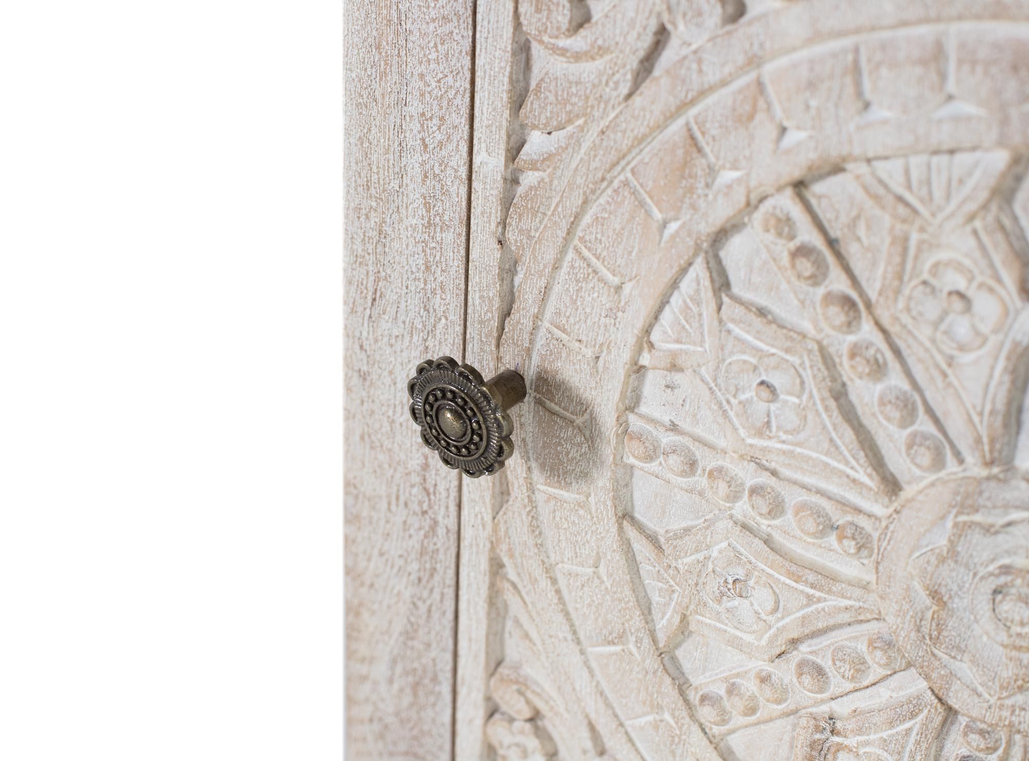 Dieser Couchtisch ist aus Mangoholz gefertigt. Die Sandoberfläche hebt die Textur und Maserung des Holzes hervor. Das Stéck besteht aus einer handgeschnitzten Vordertér mit zarten handgefertigten Motiven, die eine unverwechselbare und kénstlerische Note verleihen, und verfégt im Inneren éber ein Reg