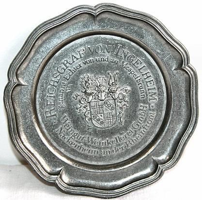sehr schöner kleiner Zinn Teller mit Wappen von Ingelheim für an die Wand zum Aufhängen in der Mitte des Tellers befindet sich ein sehr aufwendig gearbeitetes Wappen. Um das Wappen herum steht in erhabener Schrift: REICHSGRAF VON INGELHEIM genannt: ECHTER von und zu Mespelbrunn Weingut - Weinkellere