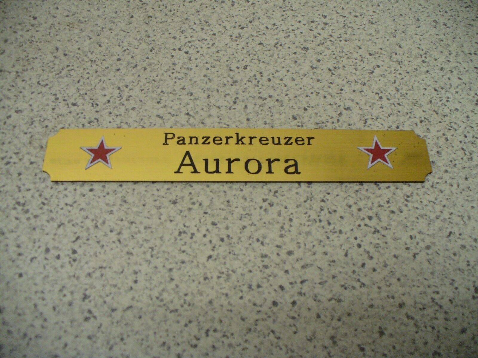 Sie bieten hier auf: 1 Kleines Namensschild - Panzerkreuzer Aurora - mit farbigen Logos (siehe Bilder) goldfarbig mit schwarzem Schriftzug (auch in weiss - oder silberfarbig möglich --> dann bitte angeben) Abmessung: 140 x 22 x 1,5 mm Das Schild ist von mir mit einer CNC-Fräse aus 1,5mm dickem, 2