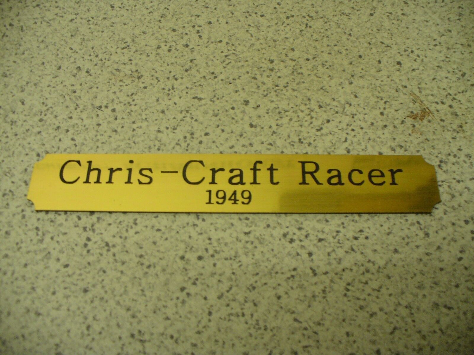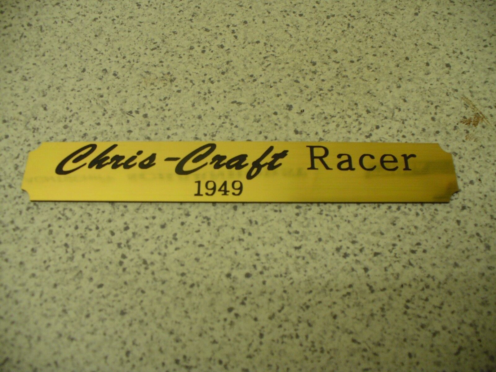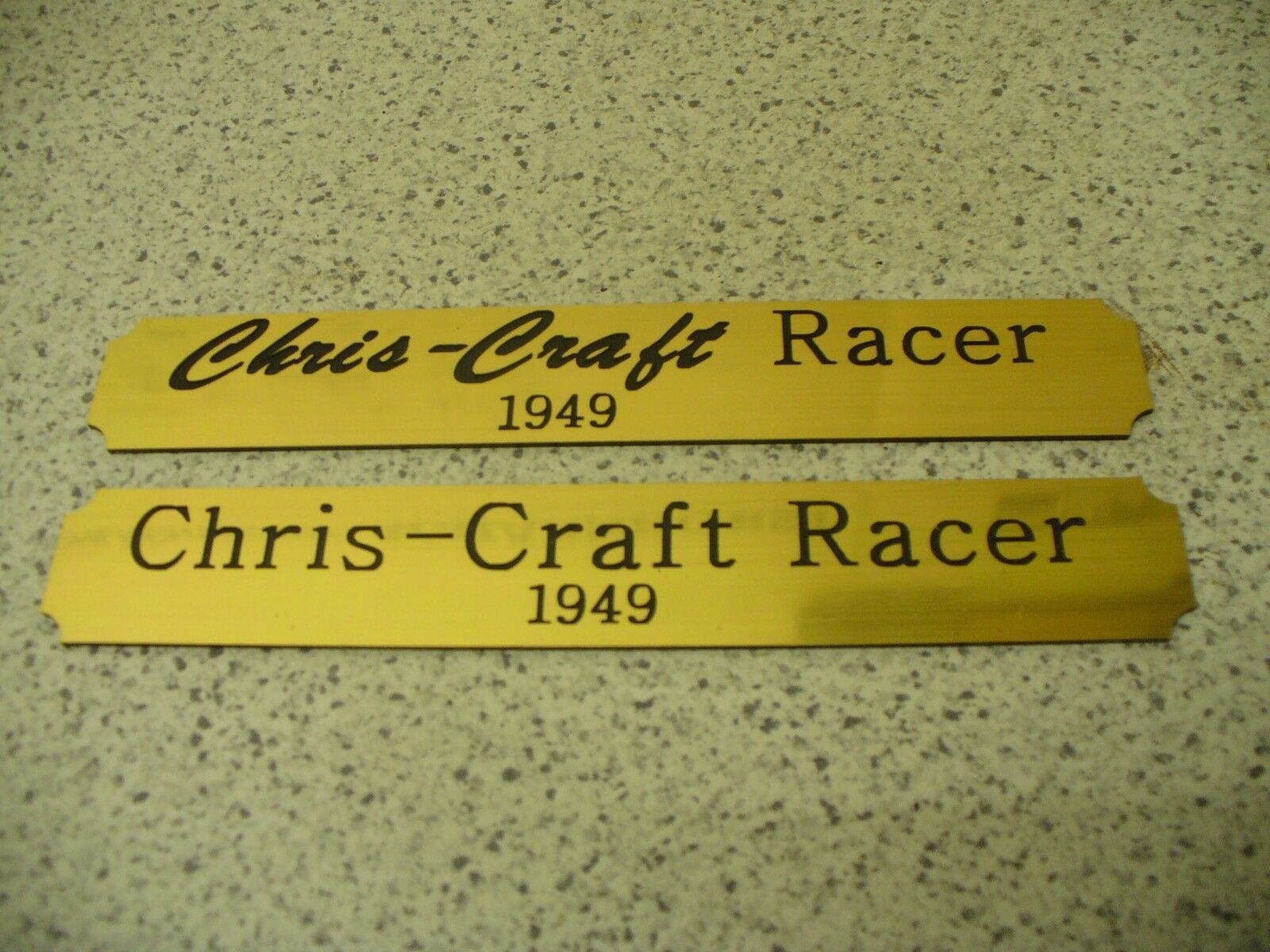 Sie bieten hier auf: 1 Kleines Namensschild - Chris-Craft Racer - (Bitte geben Sie an, welche Variante sie möchten) goldfarbig mit schwarzem Schriftzug (auch in weiss - oder silberfarbig möglich --> dann bitte angeben) Abmessung: 140 x 22 x 1,5 mm Das Schild ist von mir mit einer CNC-Fräse aus 1,