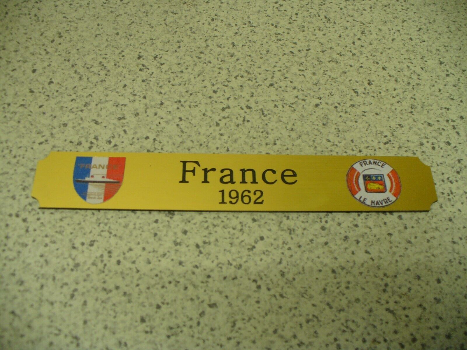 Sie bieten hier auf: 1 Kleines Namensschild - France - mit farbigen Logos (siehe Bilder) goldfarbig mit schwarzem Schriftzug (auch in weiss - oder silberfarbig möglich --> dann bitte angeben) Abmessung: 140 x 22 x 1,5 mm Das Schild ist von mir mit einer CNC-Fräse aus 1,5mm dickem, 2-farbigem Grav