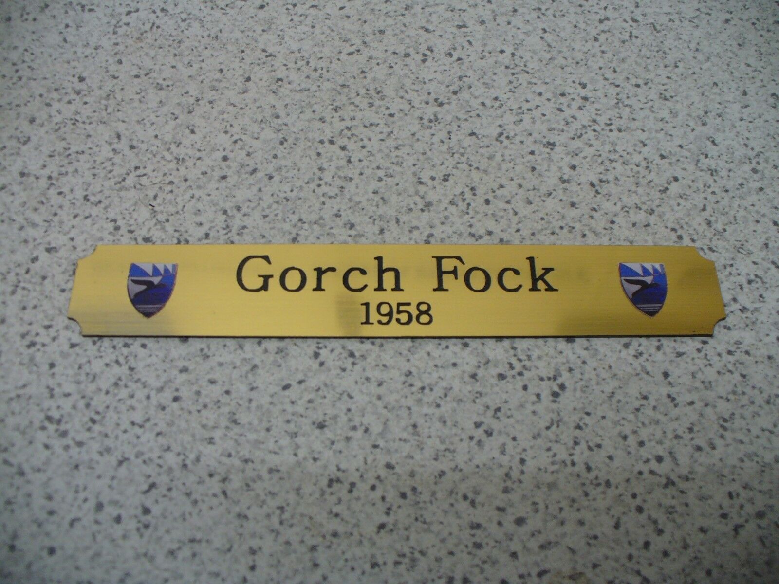 Sie bieten hier auf: 1 Kleines Namensschild - Gorch Fock - mit farbigen Wappen (siehe Bilder) goldfarbig mit schwarzem Schriftzug (auch in weiss - oder silberfarbig möglich --> dann bitte angeben) Abmessung: 140 x 22 x 1,5 mm Das Schild ist von mir mit einer CNC-Fräse aus 1,5mm dickem, 2-farbigem