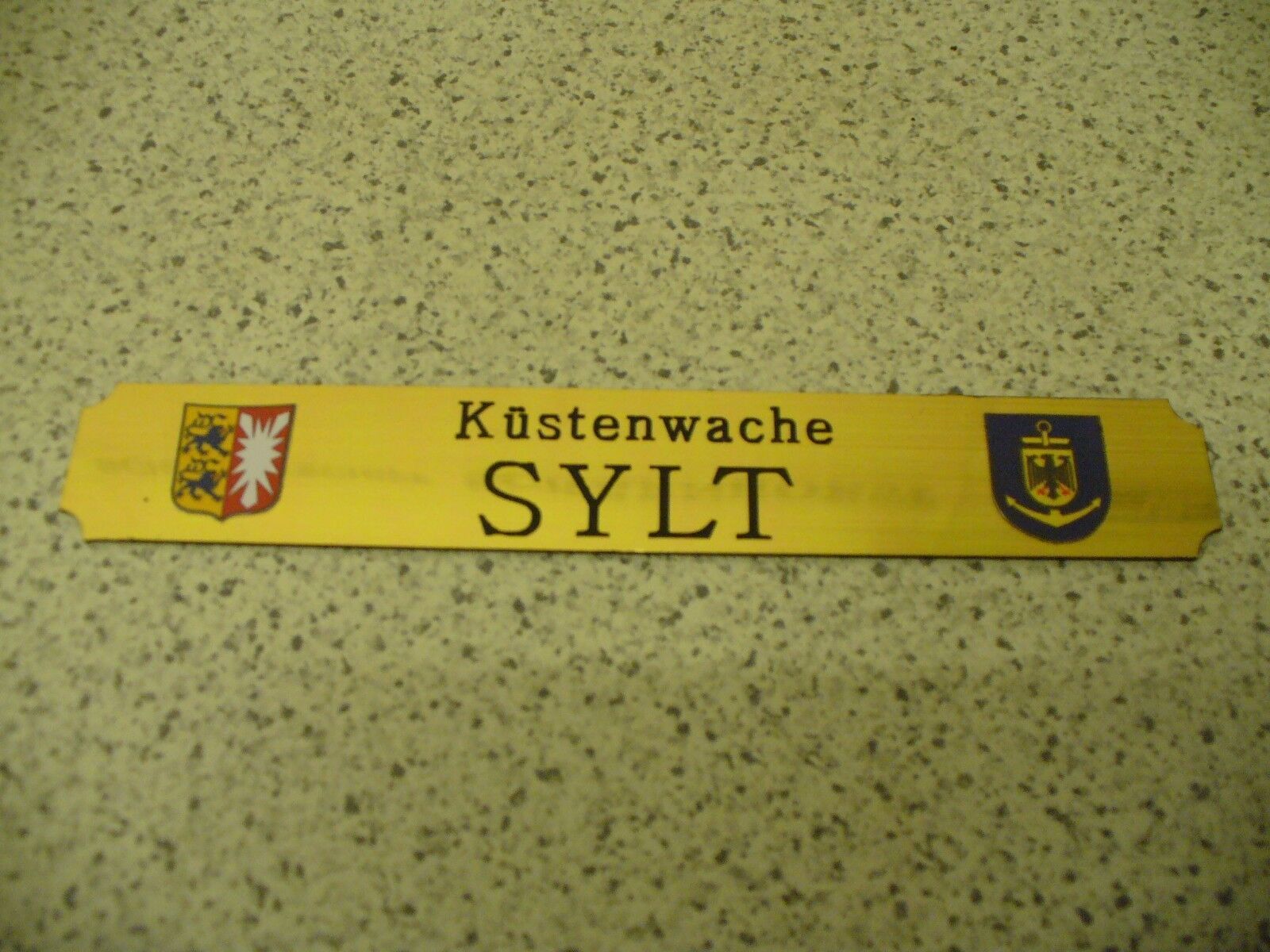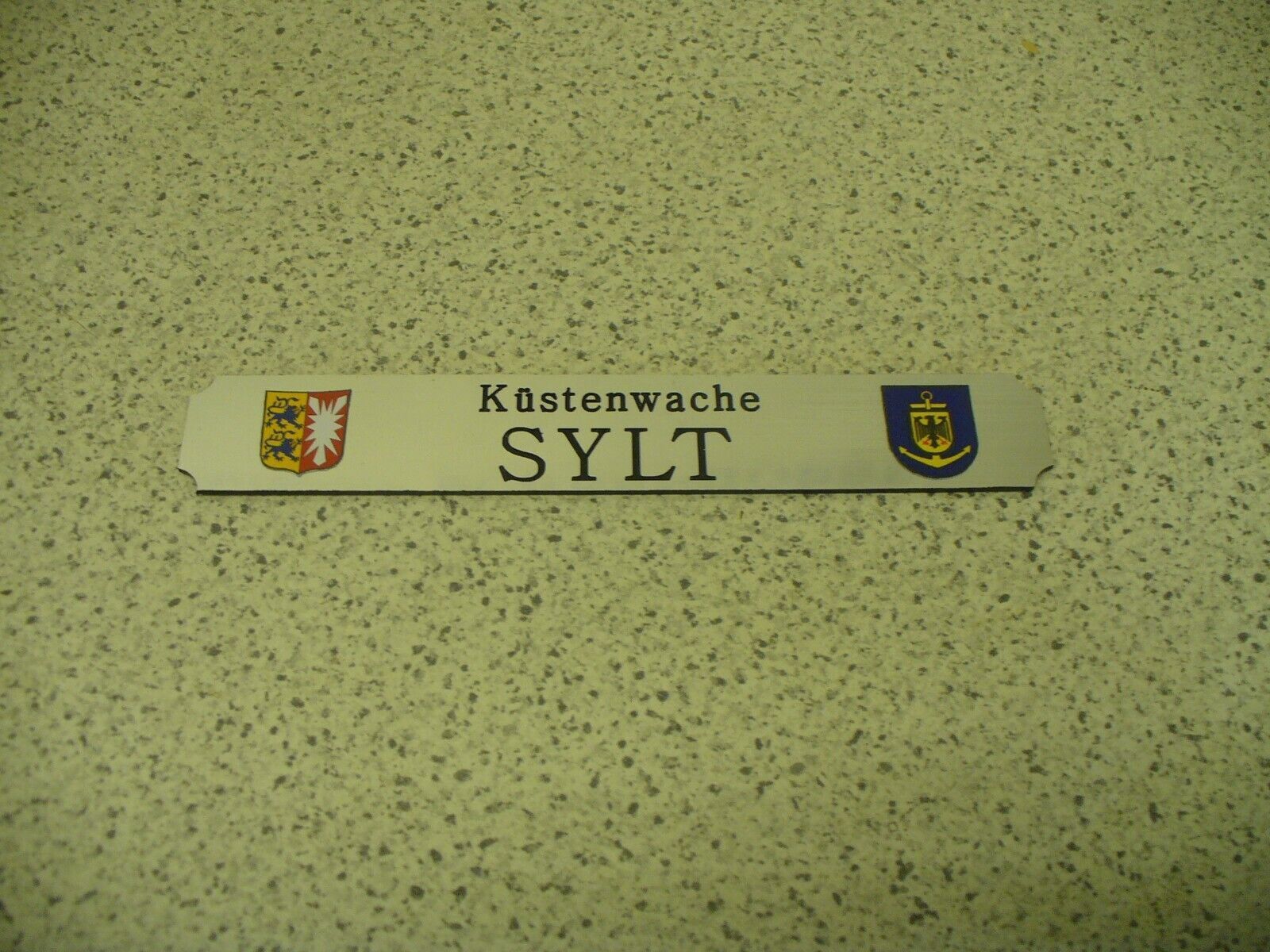 Sie bieten hier auf: 1 Kleines Namensschild - Küstenwache SYLT - mit farbigen Logos (siehe Bilder) goldfarbig mit schwarzem Schriftzug (auch in weiss - oder silberfarbig möglich --> dann bitte angeben) Abmessung: 140 x 22 x 1,5 mm Das Schild ist von mir mit einer CNC-Fräse aus 1,5mm dickem, 2-far