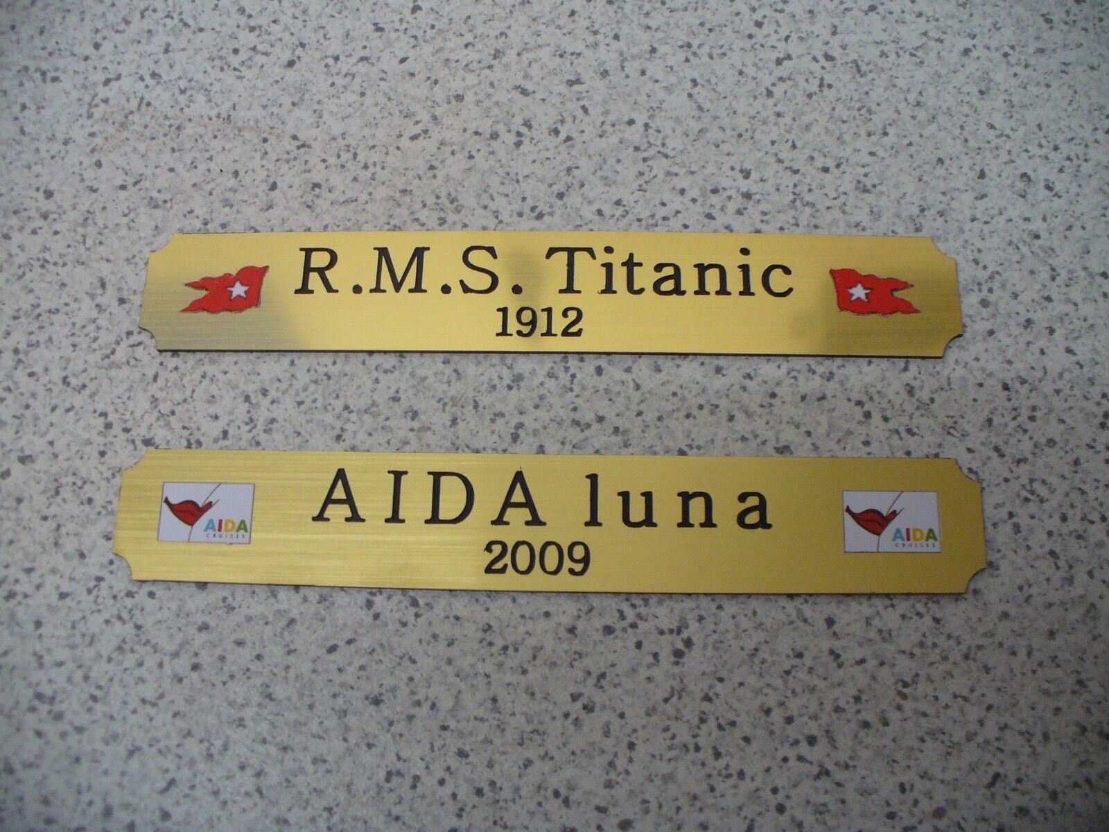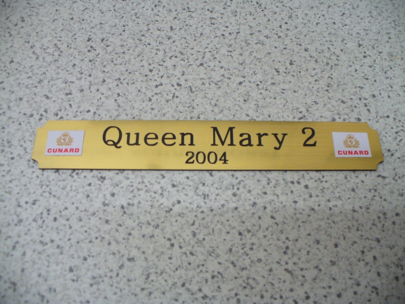 Sie bieten hier auf: 1 Kleines Namensschild - Queen Mary 2 - mit farbigen Logos (siehe Bilder) goldfarbig mit schwarzem Schriftzug (auch in weiss - oder silberfarbig möglich --> dann bitte angeben) Abmessung: 140 x 22 x 1,5 mm Das Schild ist von mir mit einer CNC-Fräse aus 1,5mm dickem, 2-farbige
