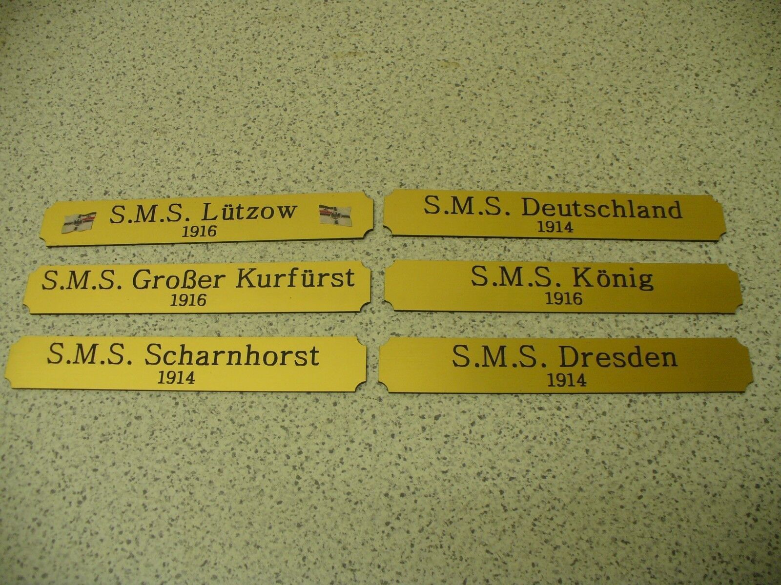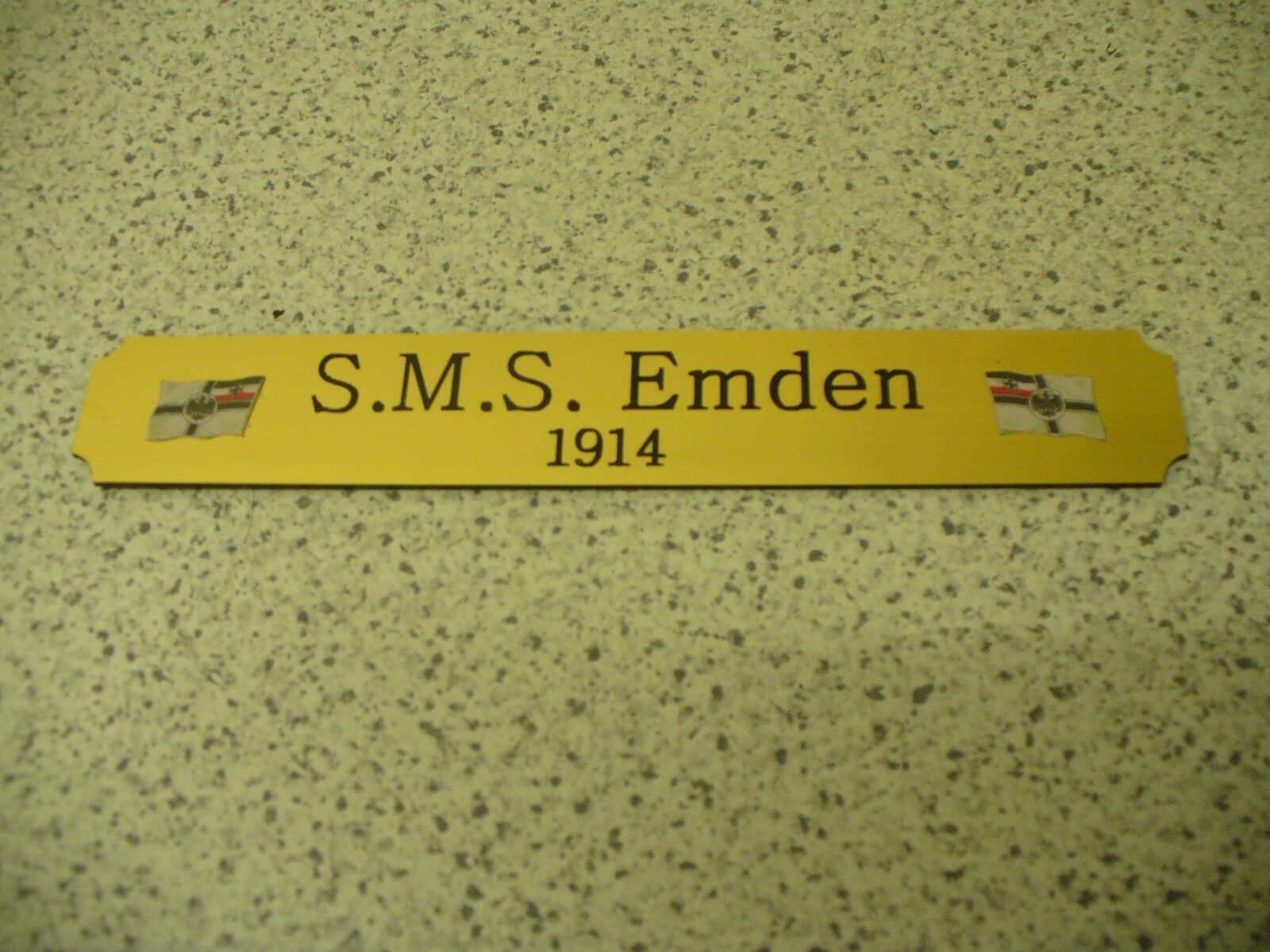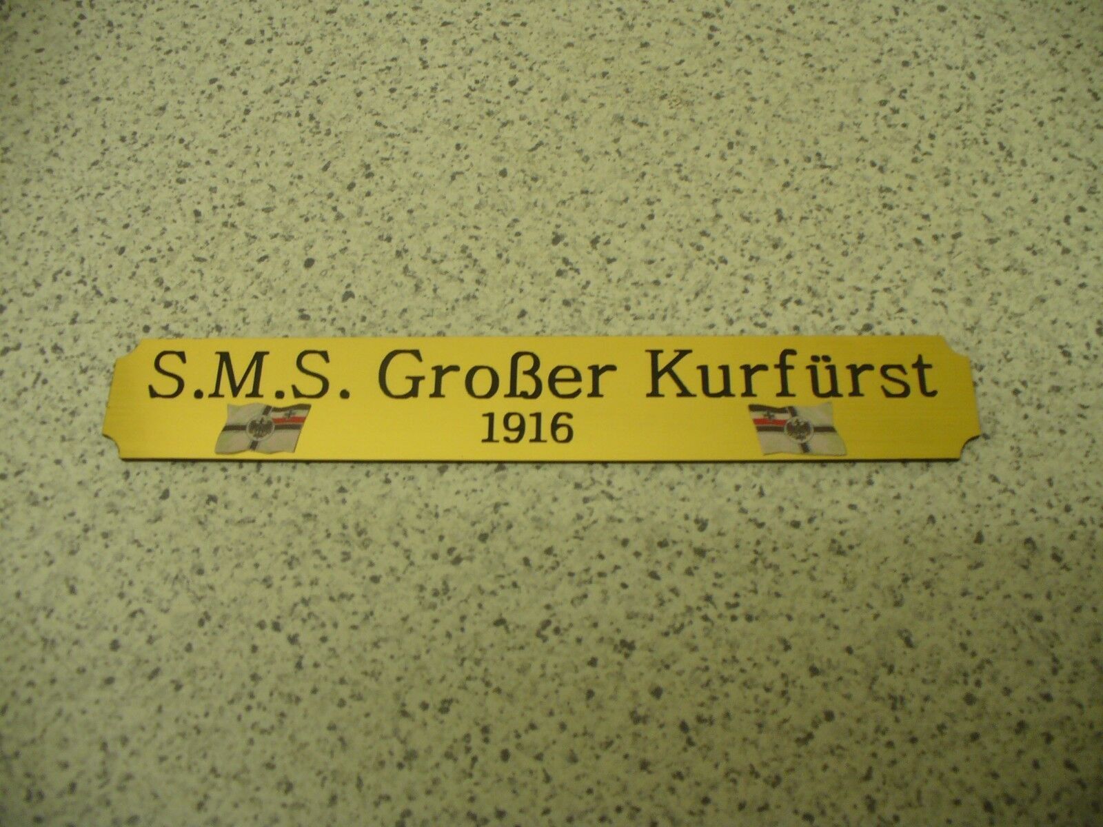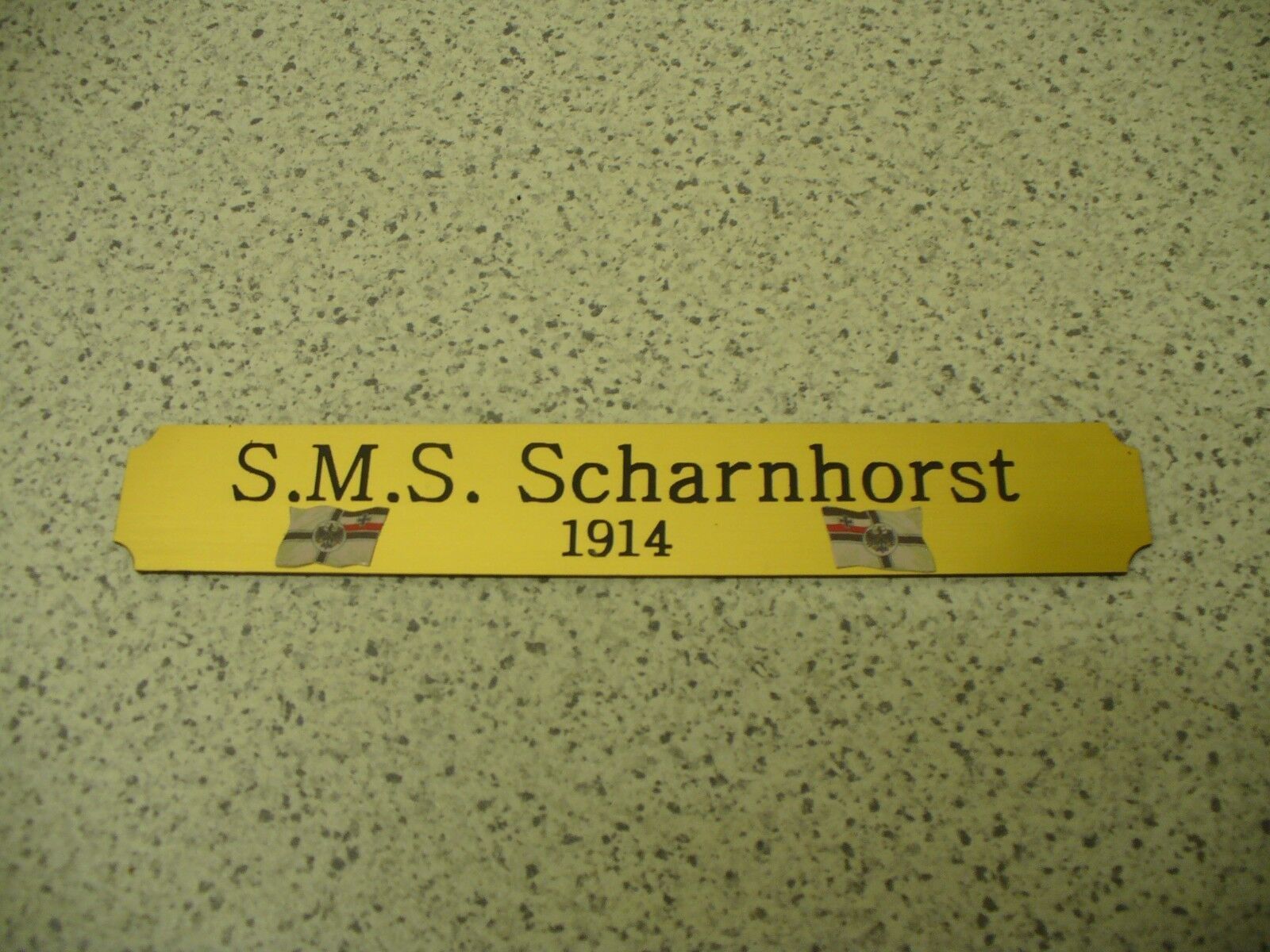 Sie bieten hier auf: 1 Kleines Namensschild - SMS Scharnhorst - mit farbigen Flaggen (siehe Bilder) goldfarbig mit schwarzem Schriftzug (auch in weiss - oder silberfarbig möglich --> dann bitte angeben) Abmessung: 140 x 22 x 1,5 mm Das Schild ist von mir mit einer CNC-Fräse aus 1,5mm dickem, 2-fa
