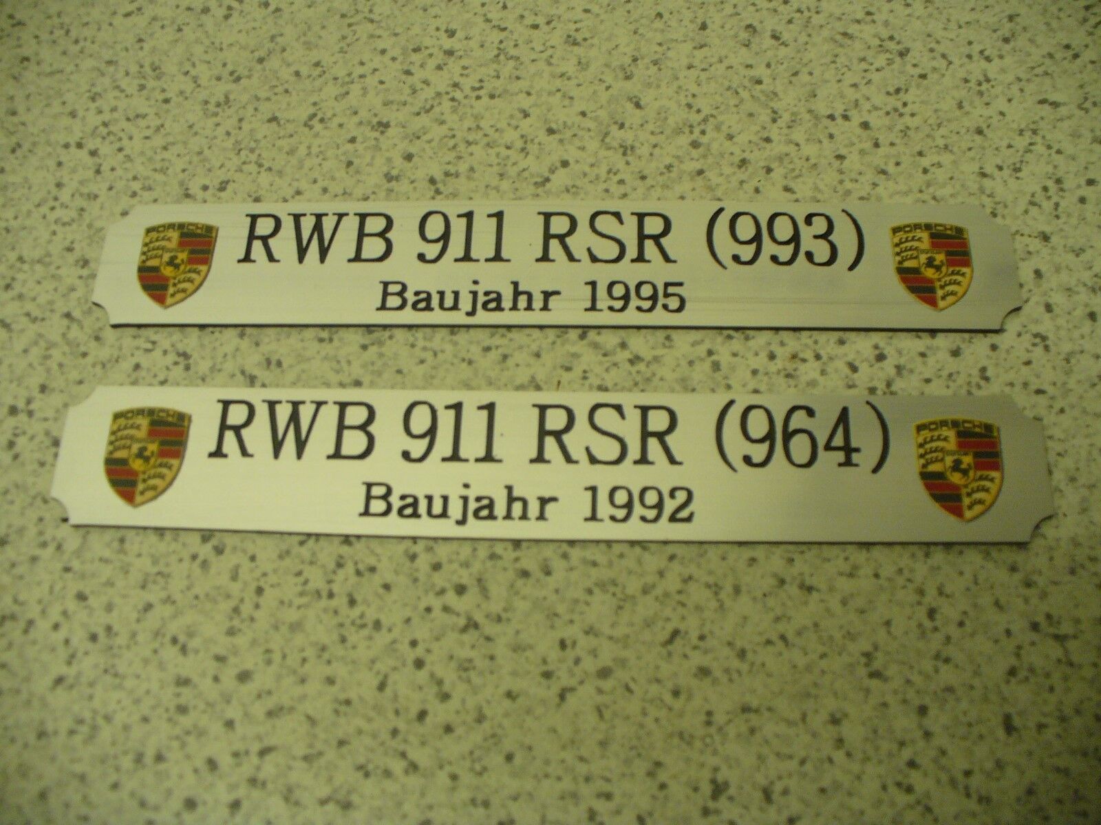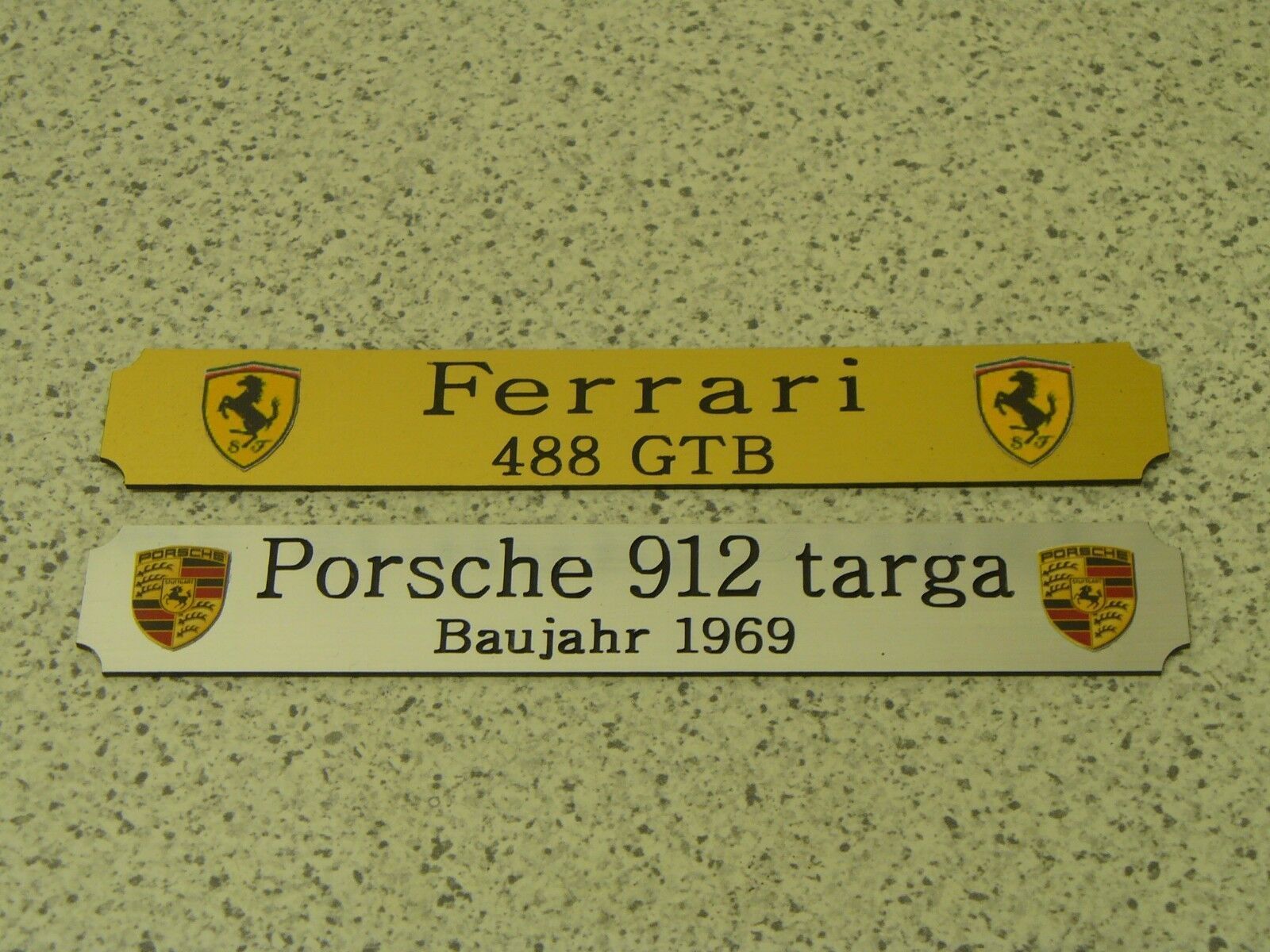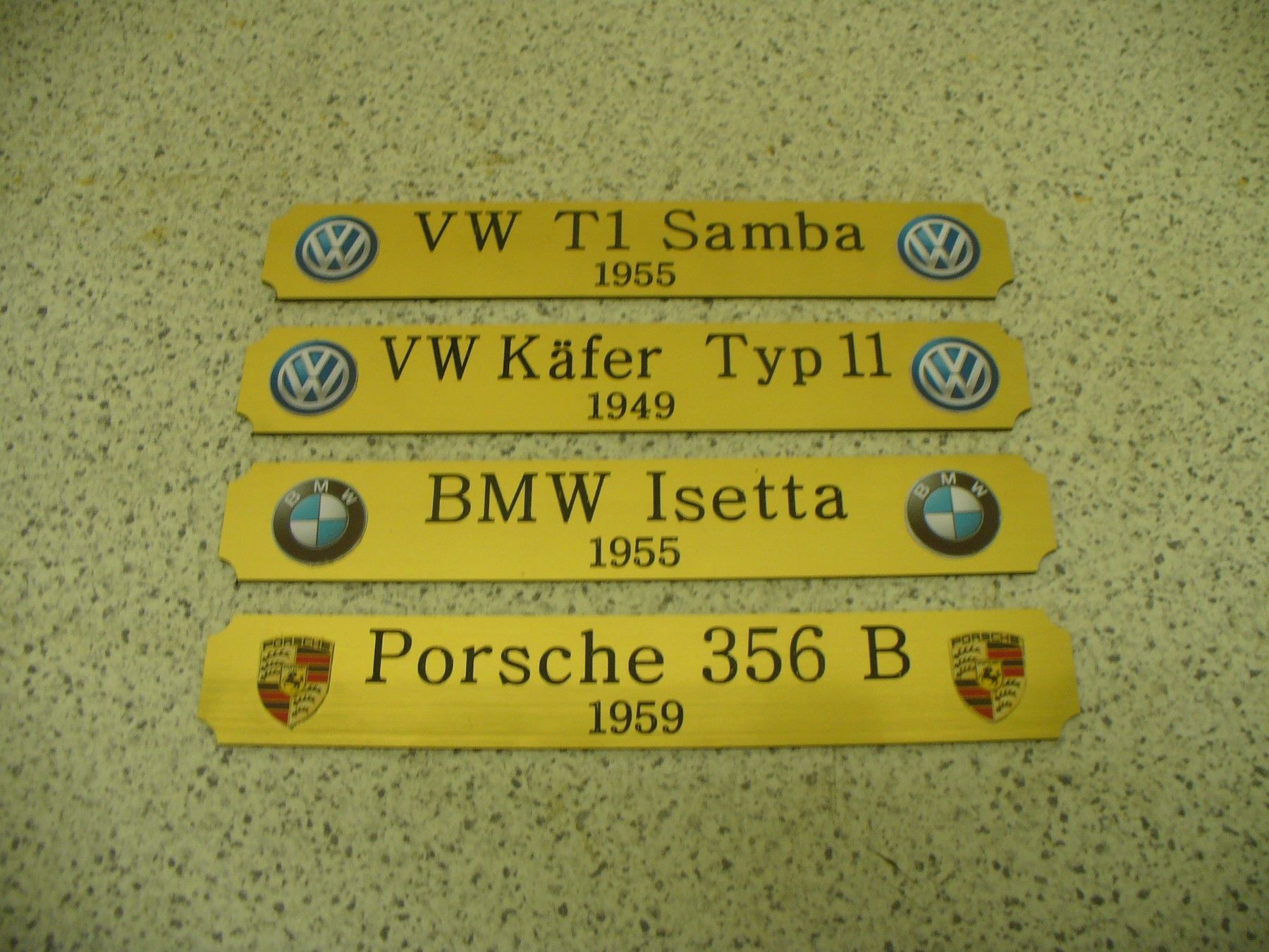 Sie bieten hier auf: 1 Kleines Namensschild - VW Käfer (Typ11) - (andere Typen gerne auf Anfrage - siehe auch Fotos) mit farbigen Logos (siehe Bilder) goldfarbig mit schwarzem Schriftzug (auch in weiss - oder silberfarbig möglich --> dann bitte angeben) Abmessung: 140 x 22 x 1,5 mm Das Schild ist