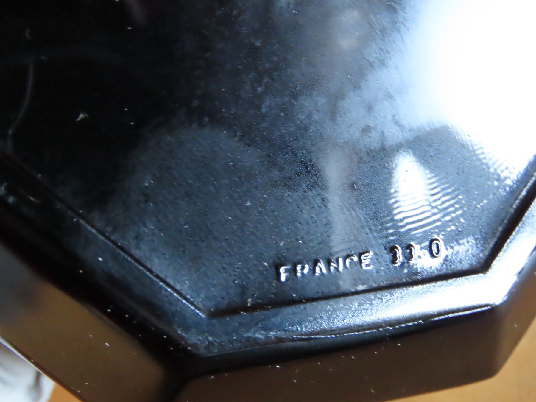 Maße: ca. 5 cm hoch x ca. 12,5 cm Durchmesser --- von Ecke zu Ecke gemessen -Deckel nicht mit gemessen Stellfläche hat einen Durchmesser von ca. 9,5 cm -- Material: Glas ist leicht verschmutzt verstaubt,hat feine Kratzer Made in France