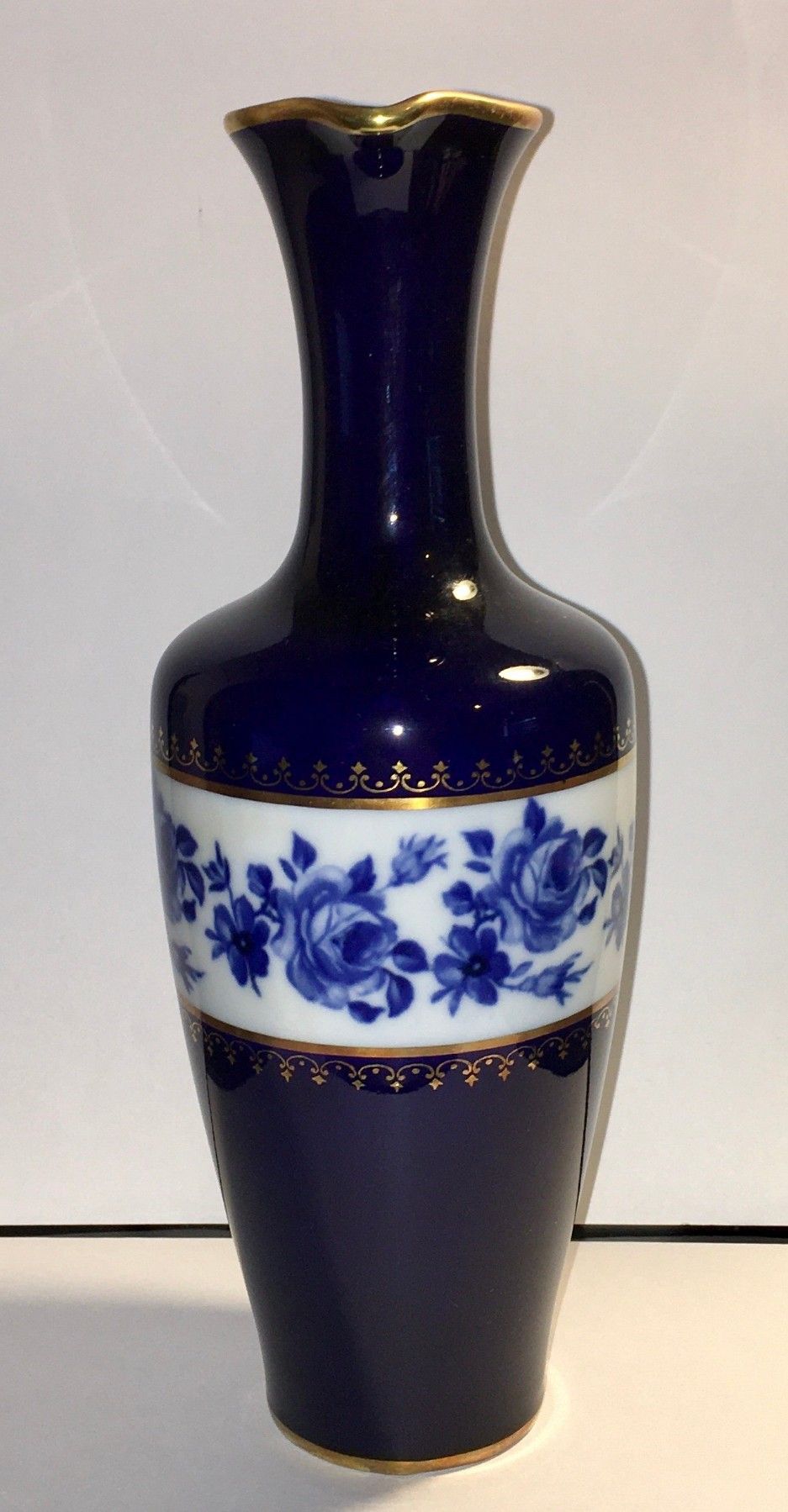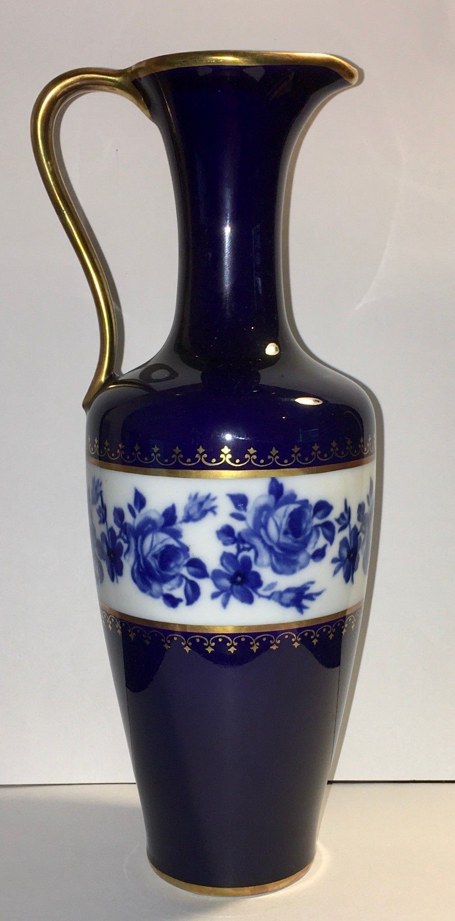 Schöne handgemachte Henkelvase der Manufraktur KMP Bavaria, Echt Cobald, 24,5 cm hoch, Farbe: Kobaltblau mit Goldrand und goldenen Henkel. Mit einem Streifen blauer Rosen auf weißen Hintergrund.