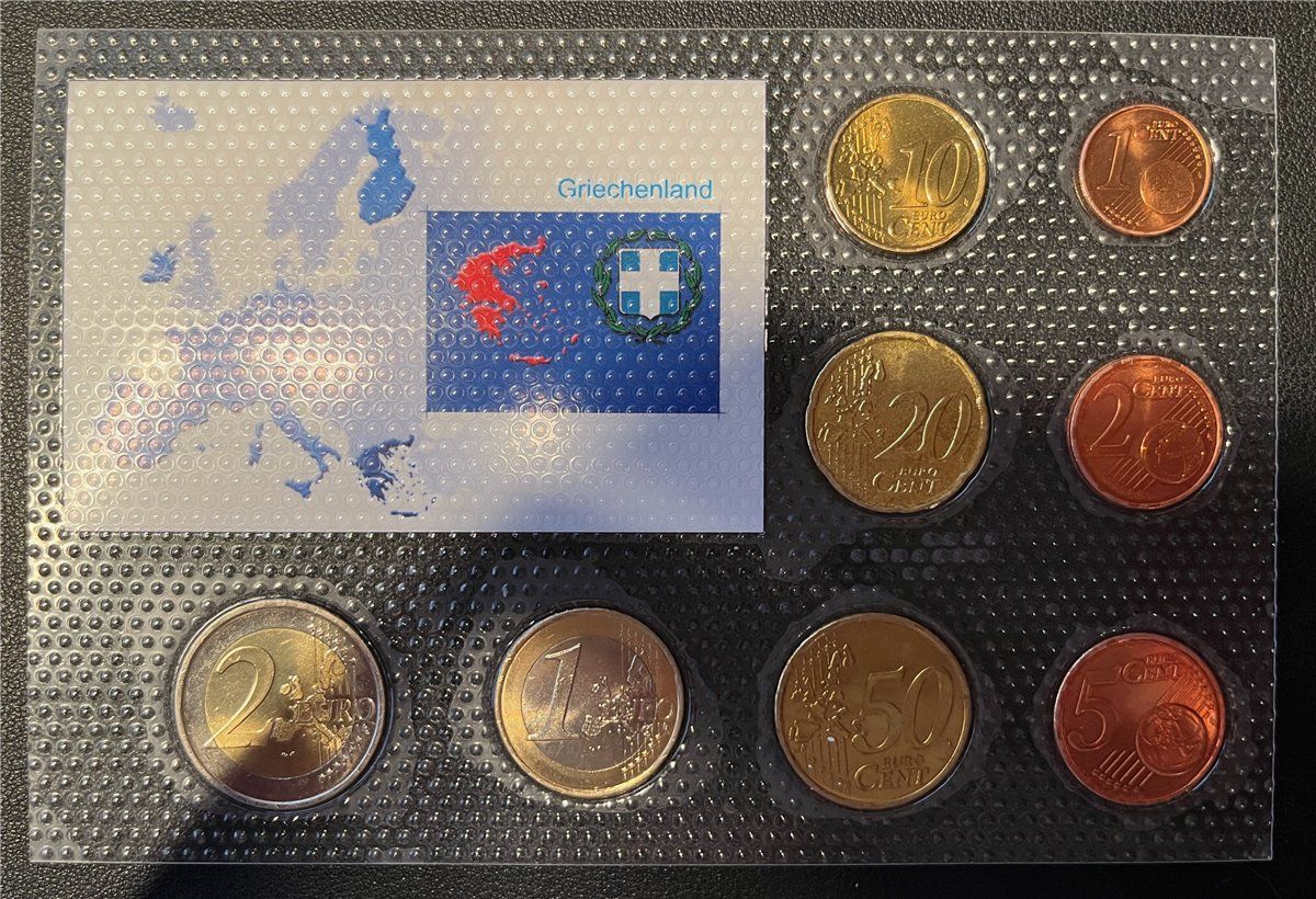 Bezeichnung Designation: KMS - Griechenland 2005 - EURO-Motivsatz - ( auf Folie verschweißt ) Auflage edition: . . Erhaltung conservation: Stempelglanz Nominalwert face value: 1 Cent - 2 Euro (Komplett) Prägejahr year of issue: 2005 Verpackung Packaging: Blister (Kratzer möglich) Blister (scratches