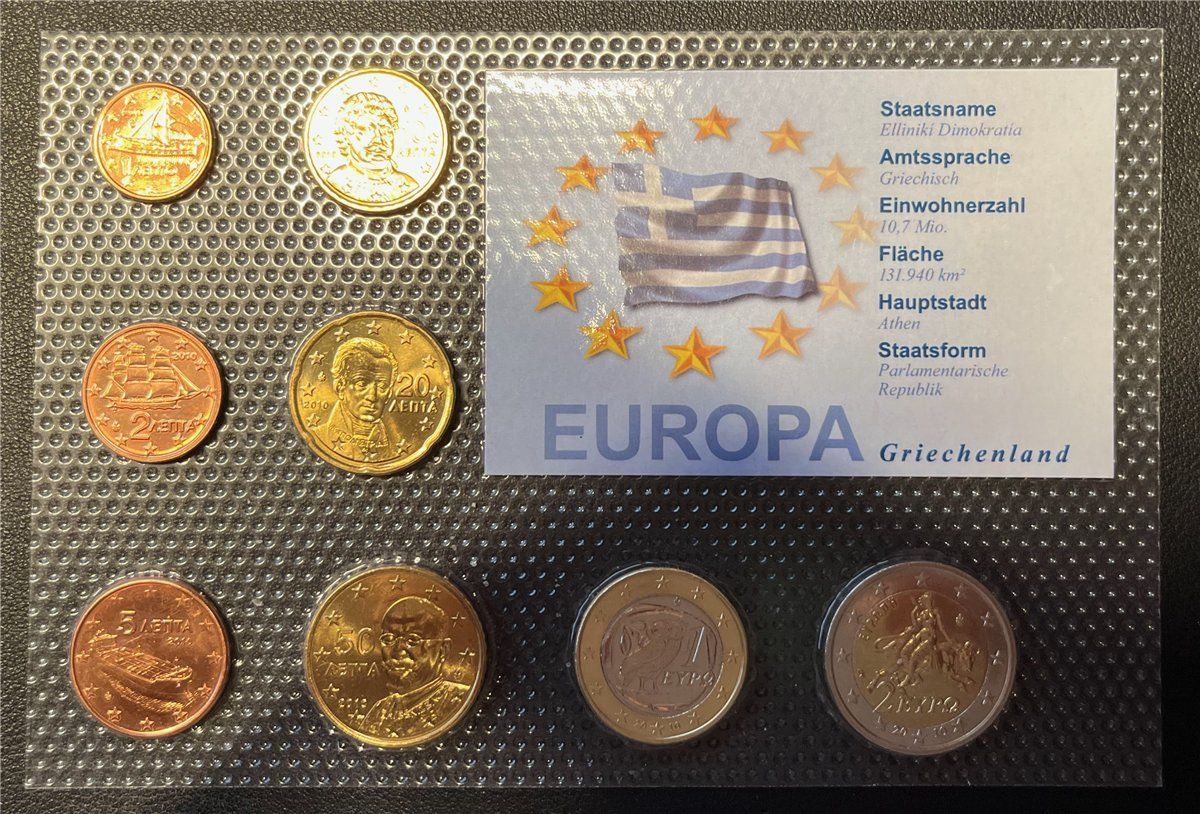 Bezeichnung Designation: KMS - Griechenland 2010 - EURO-Motivsatz - ( auf Folie verschweißt ) Auflage edition: . . Erhaltung conservation: Stempelglanz Nominalwert face value: 1 Cent - 2 Euro (Komplett) Prägejahr year of issue: 2010 Verpackung Packaging: Blister (Kratzer möglich) Blister (scratches