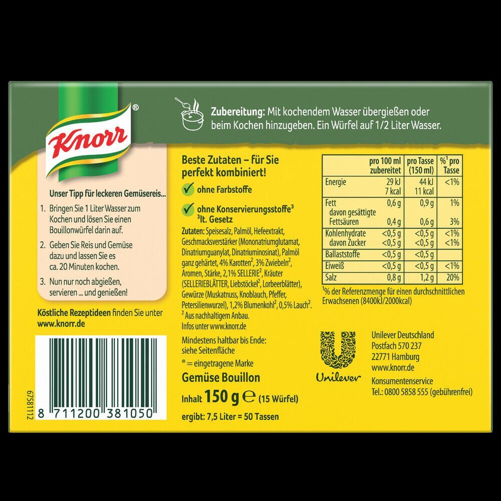 Bezeichnung des Lebensmittels Gemüse Bouillon Verzeichnis der Zutaten Zutaten: Speisesalz, Palmöl, Hefeextrakt, Geschmacksverstärker (Mononatriumglutamat, Dinatriumguanylat, Dinatriuminosinat), Palmöl ganz gehärtet, 4% Karotten², 3% Zwiebeln², Aromen, Stärke, 2,1% SELLERIE², Kräuter (SELLERIEBLÄTTER... Mehr