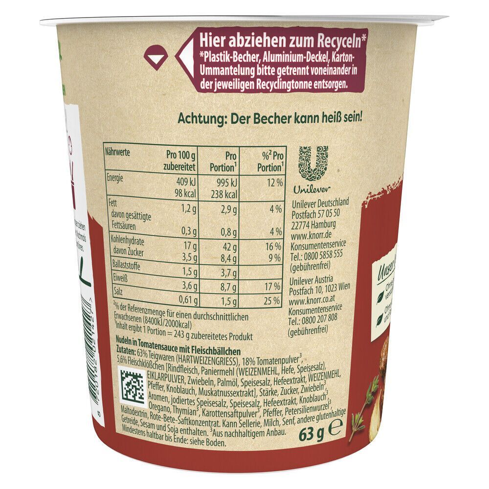 Knorr Knorr Pasta Snack Tomate & Fleischbällchen 63 g Dose 8er Pack