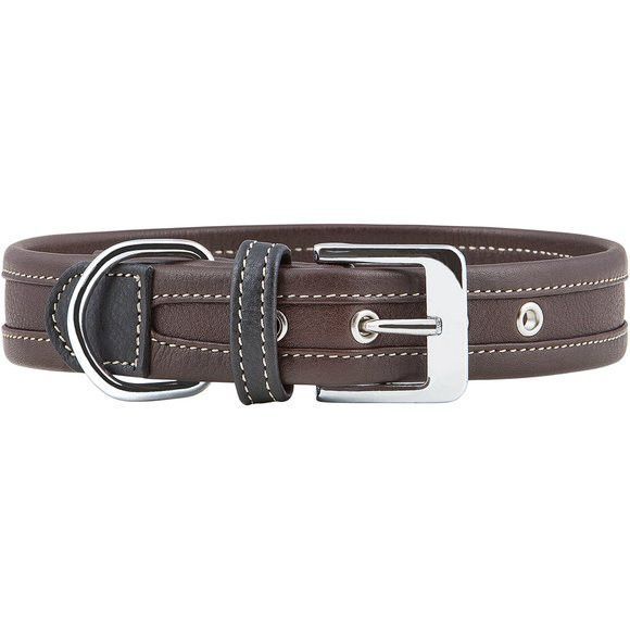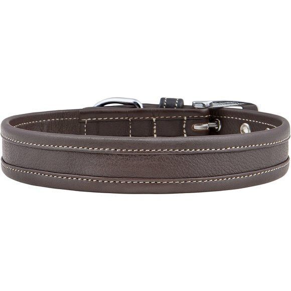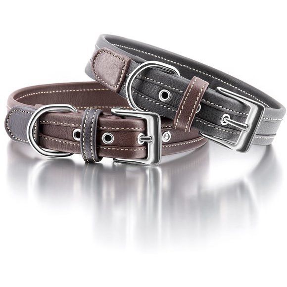 Das Hundehalsband besteht aus besonders weichen, an den Seiten umgeschlagenen Rindnappaleder. Für die elegante Optik des Halsbandes sorgen abgesetzte Ziernähte und kontrastfarbige Aufnäher . Die gute Verarbeitung des Lederhalsbandes bezieht auch die dekorativen Metallteile ein, Die zum Schutz vor witterungsbedingten Schäden verzinkt ist. Das Halsband hat eine hohe Griffigkeit mit einer äußerst angenehmen Haptik.