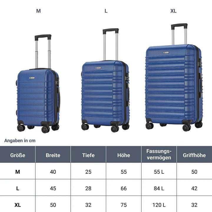 Hartschalen Kofferset Rom 3 tlg. Set mit schlagfester ABS-Hartschale, 360° Rollen Artikelnummer: 51625 - Blau 3-teilig B-WARE mit 12 Monate Gewährleistung Bitte haben Sie Verständnis, dass wir keine Möglichkeit haben Original-Fotos einzelner Produkte zu erstellen. Technische Daten: Material Hartscha... Mehr