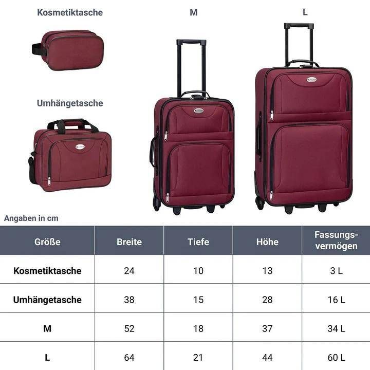 Reise Trolley Kofferset Athen 5-teiliges Set mit 2 Trolleys, Umhänge- und 2 Kosmetiktaschen Artikelnummer: 51603 - Bordeaux B-WARE mit 12 Monate Gewährleistung Bitte haben Sie Verständnis, dass wir keine Möglichkeit haben Original-Fotos einzelner Produkte zu erstellen. Technische Daten: Material: Al... Mehr
