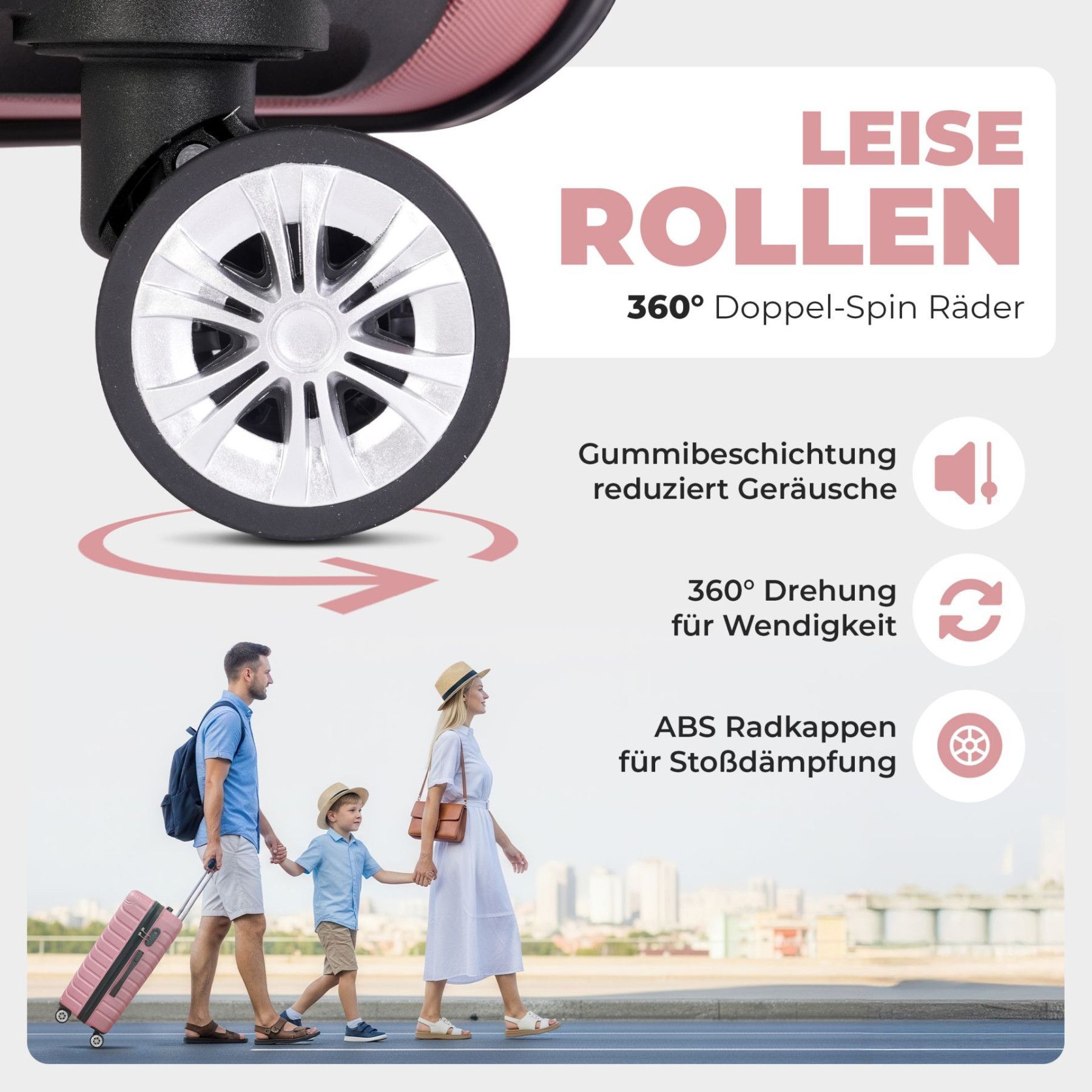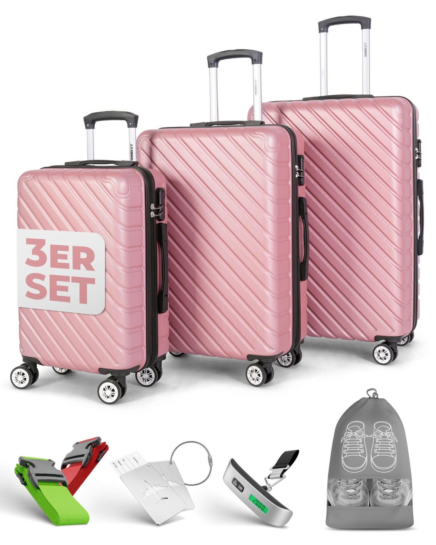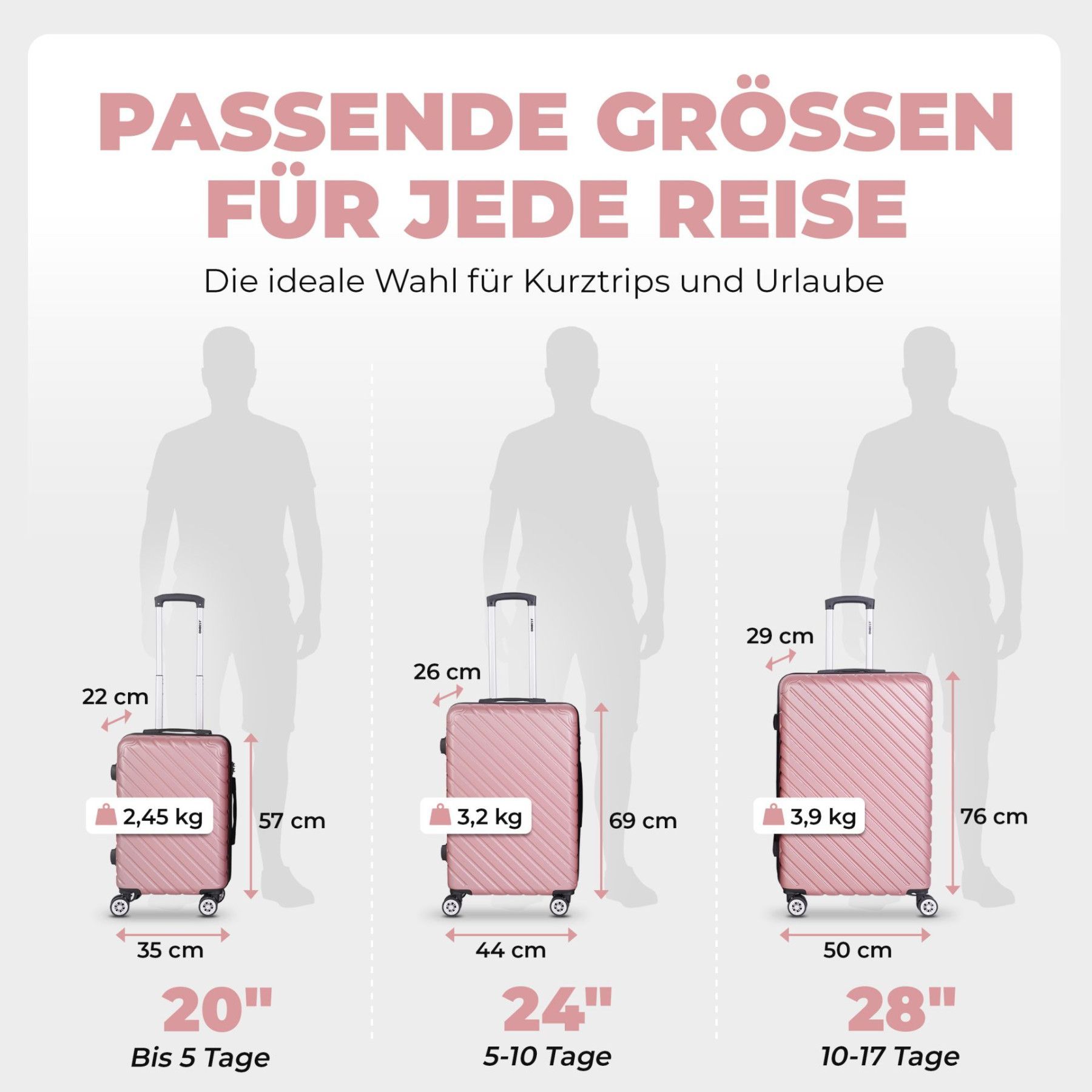 3er Kofferset PREMIUM Rose Gold Dezente Eleganz für stilsichere Reisen Das Kofferset bietet dir drei Größen in einem edlen Rose Gold-Finish. Mit 20 , 24 und 28 bist du für Kurztrip, Urlaub oder Geschäftsreise perfekt ausgestattet. Robuste ABS-Hartschale Stabil und stoßfest – schützt dein Gepäck zuve