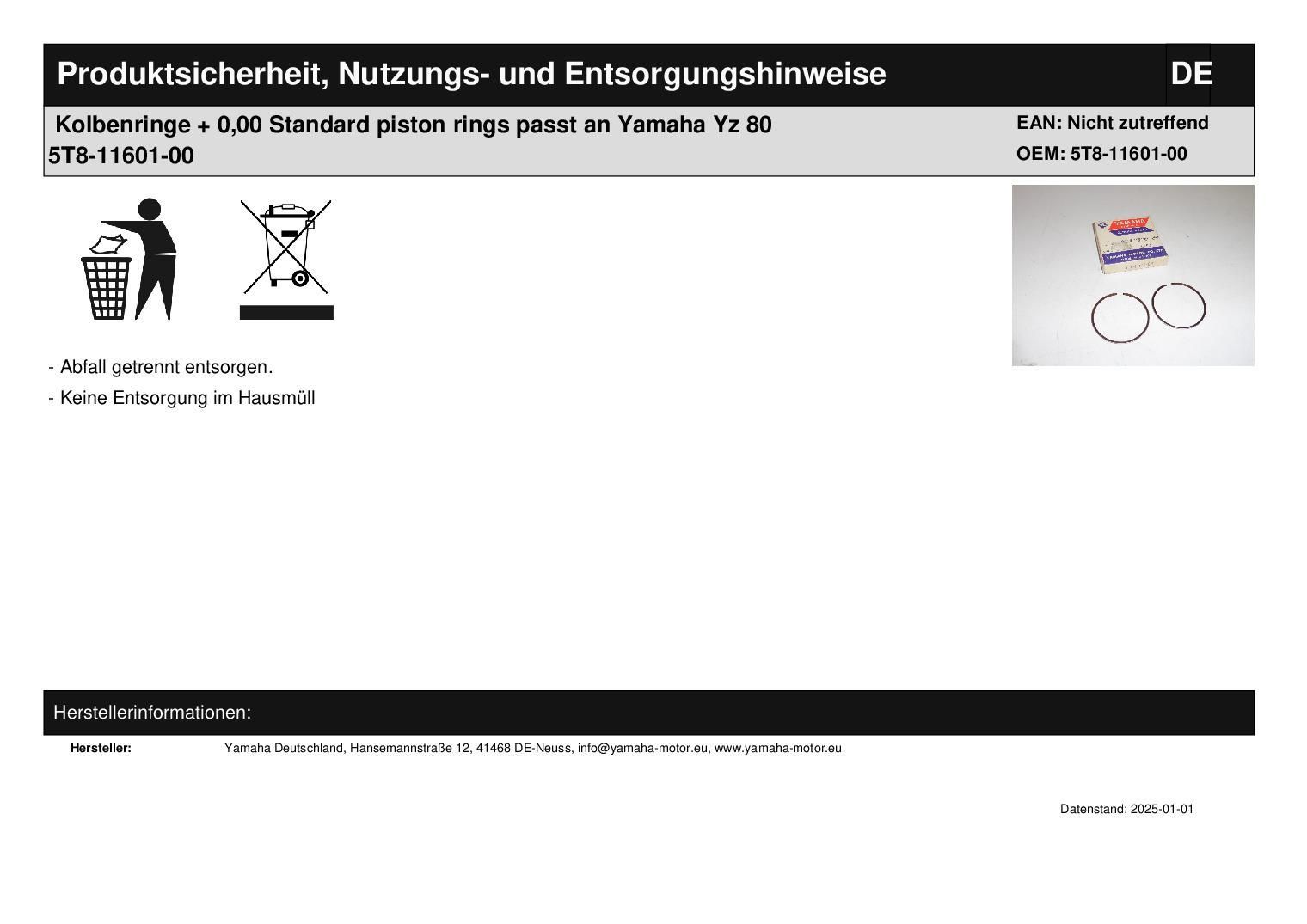 Kolbenringe + 0,00 Standard piston rings passt an Yamaha Yz 80 5T8-11601-00