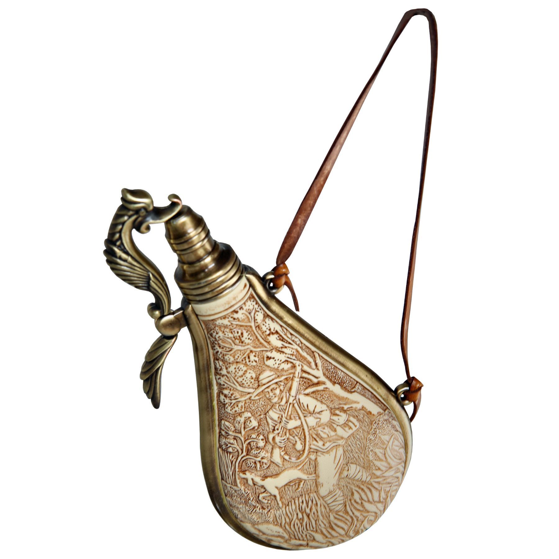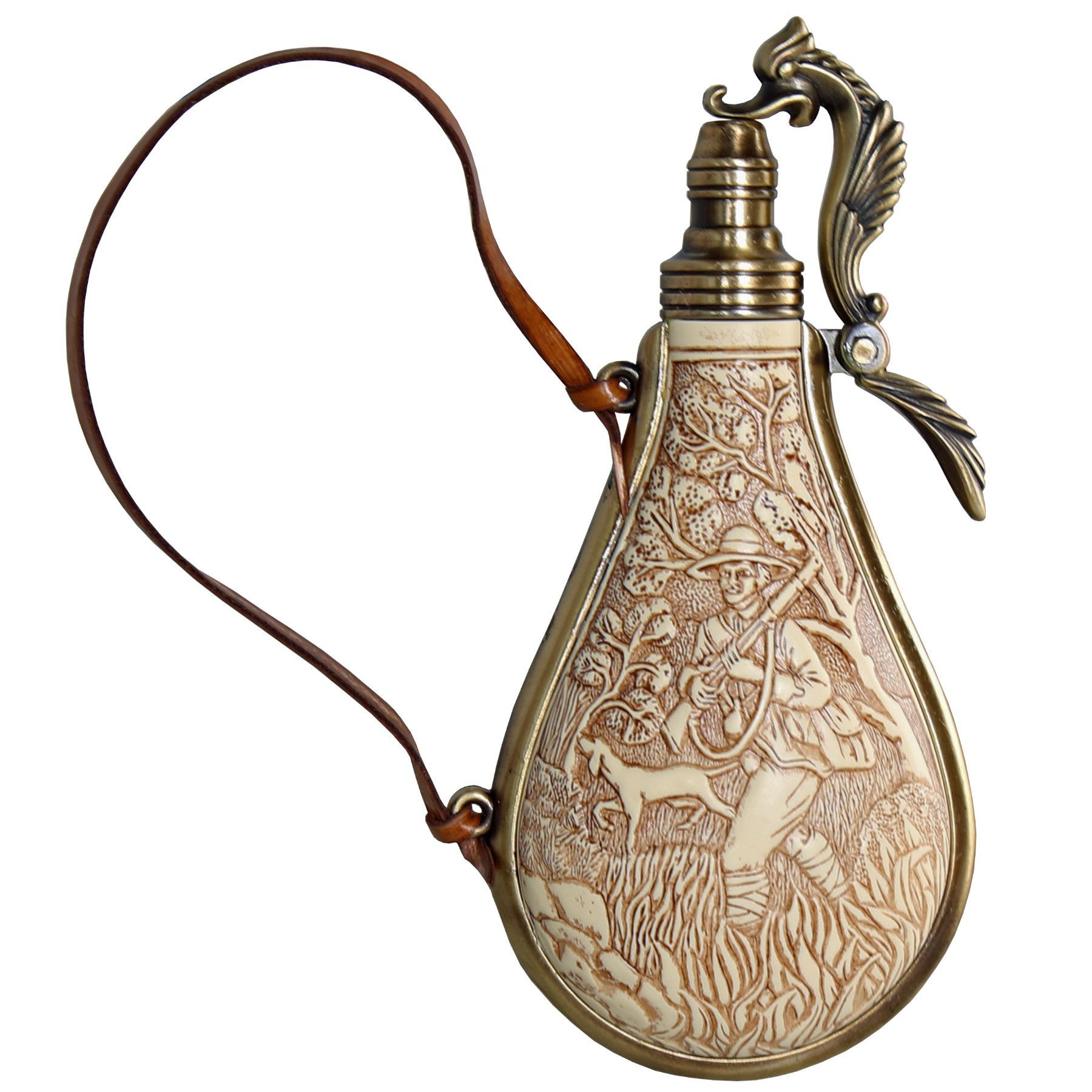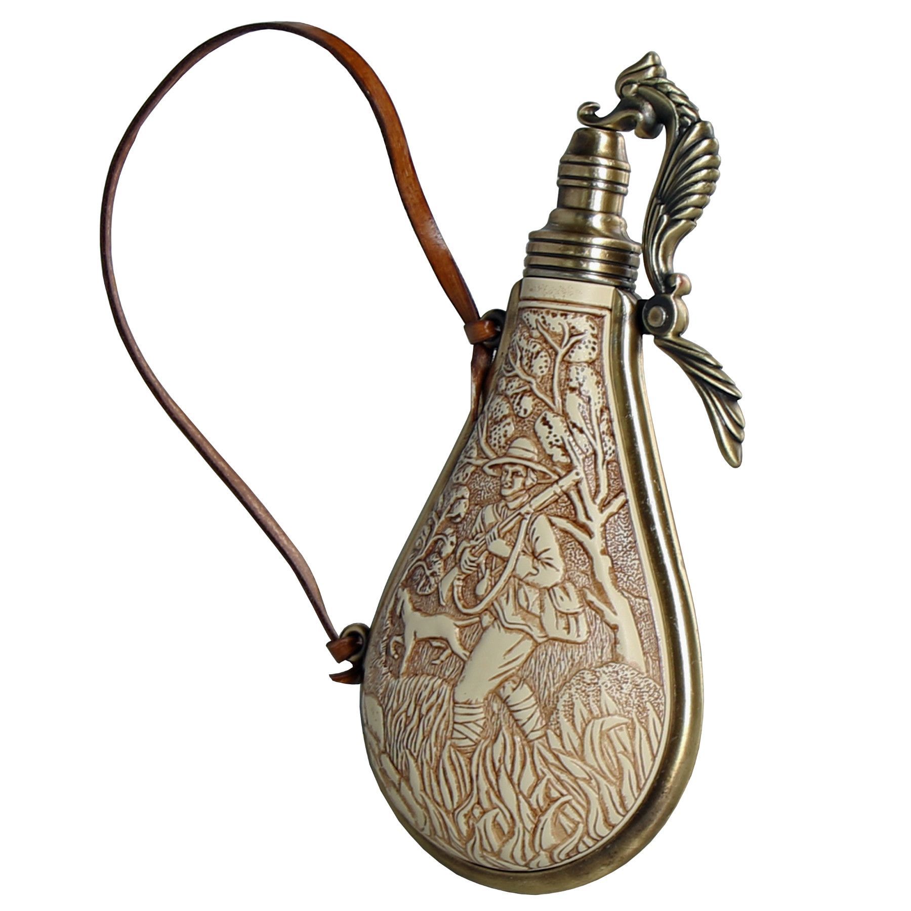 Haller Kolser Pulverflasche mit Jagdmotiv und Lederband 18 x 10 cm, Deko, Historie