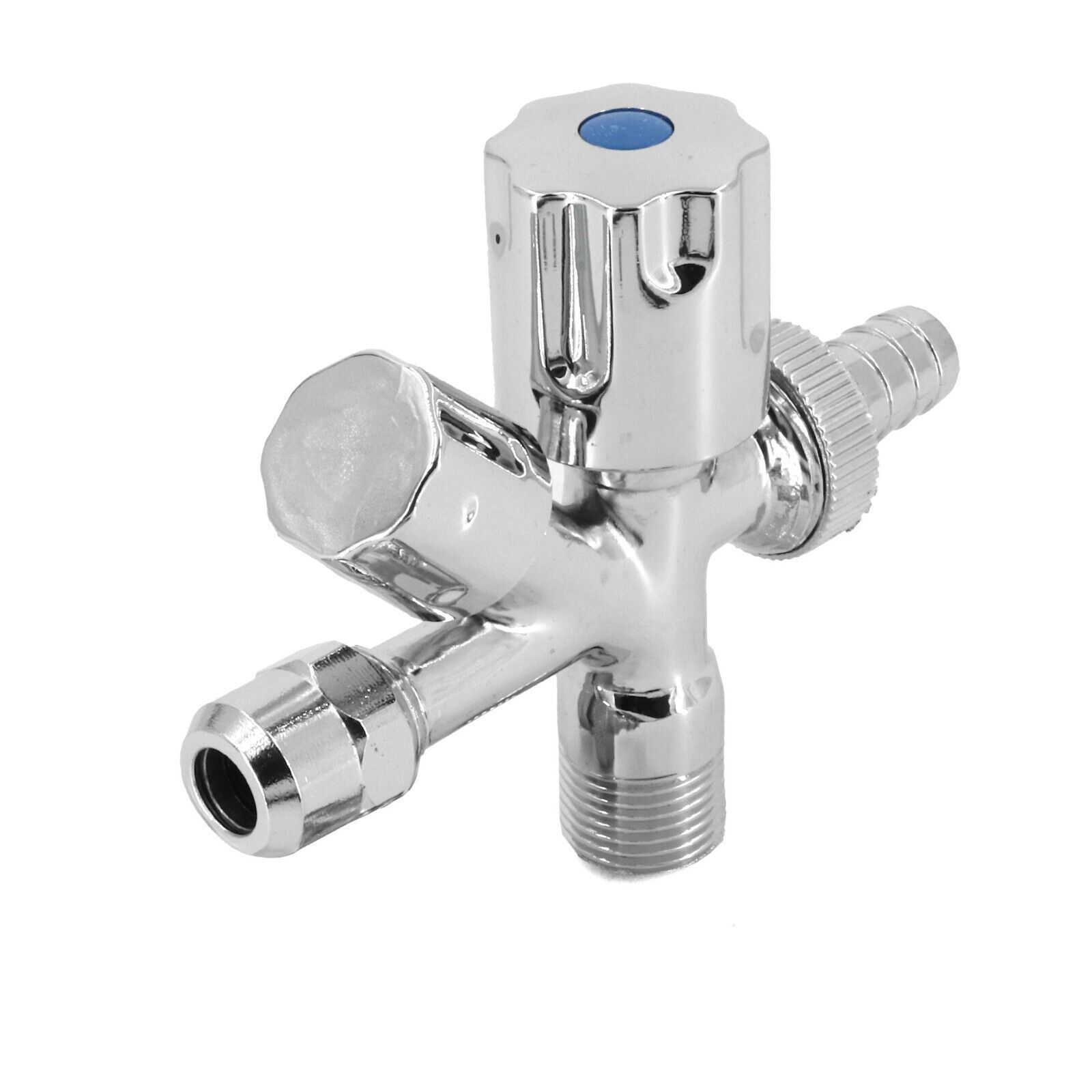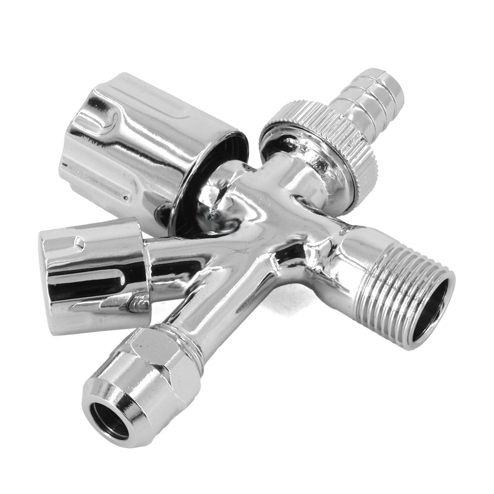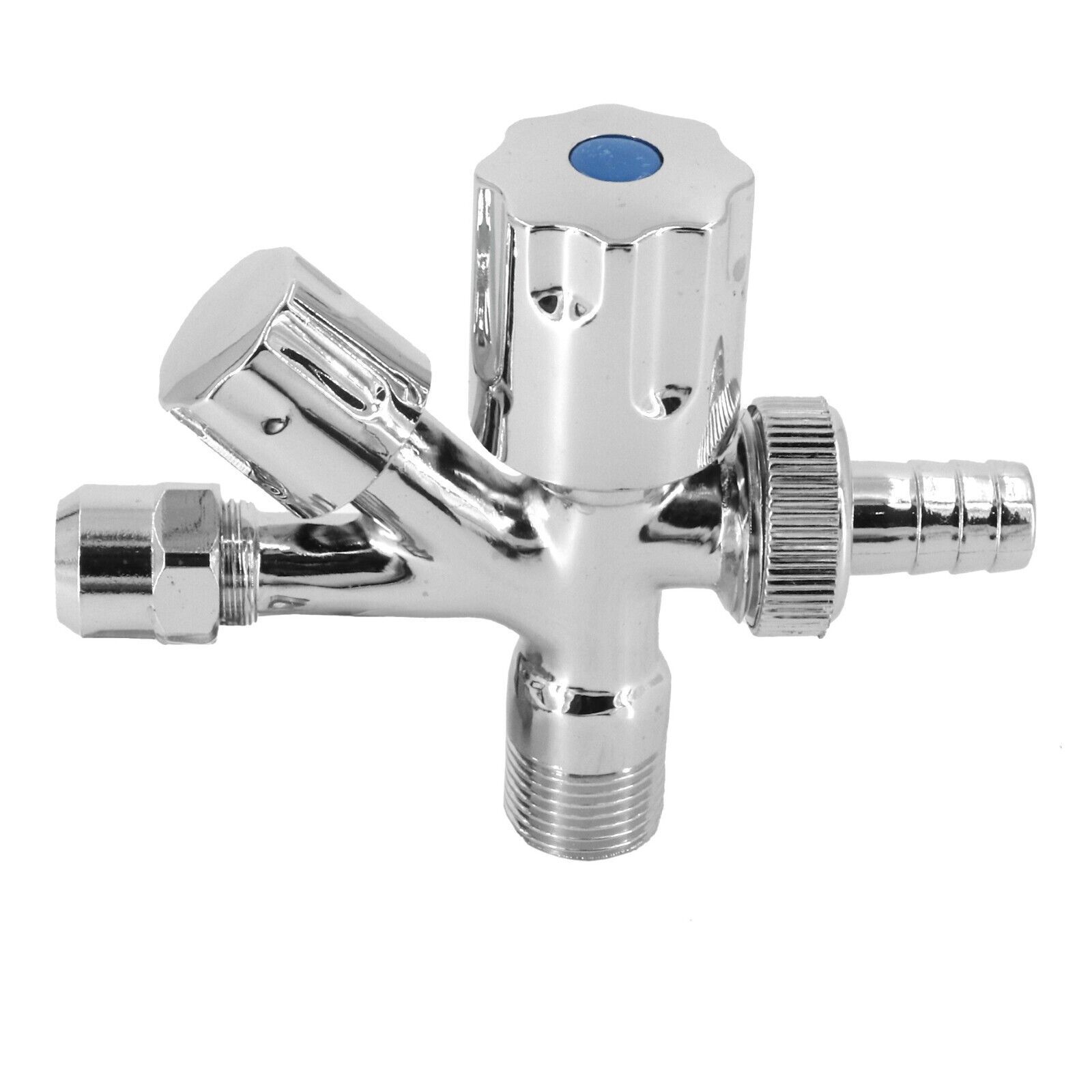 Kombi Eckventil 3 8 x 1 2 x 3 4 Geräteventil Kombi-Eckventil: - Geeignet zum Anschluss von Wasch & Spülmaschine in Verbindung mit einer Batterie - 3 8 mit Quetschverschraubung Ø 10mm - Mit Rosette - Material: Messing - Oberfläche: verchromt