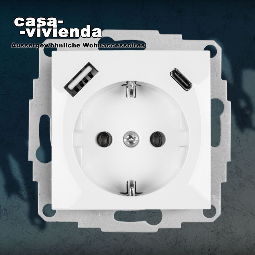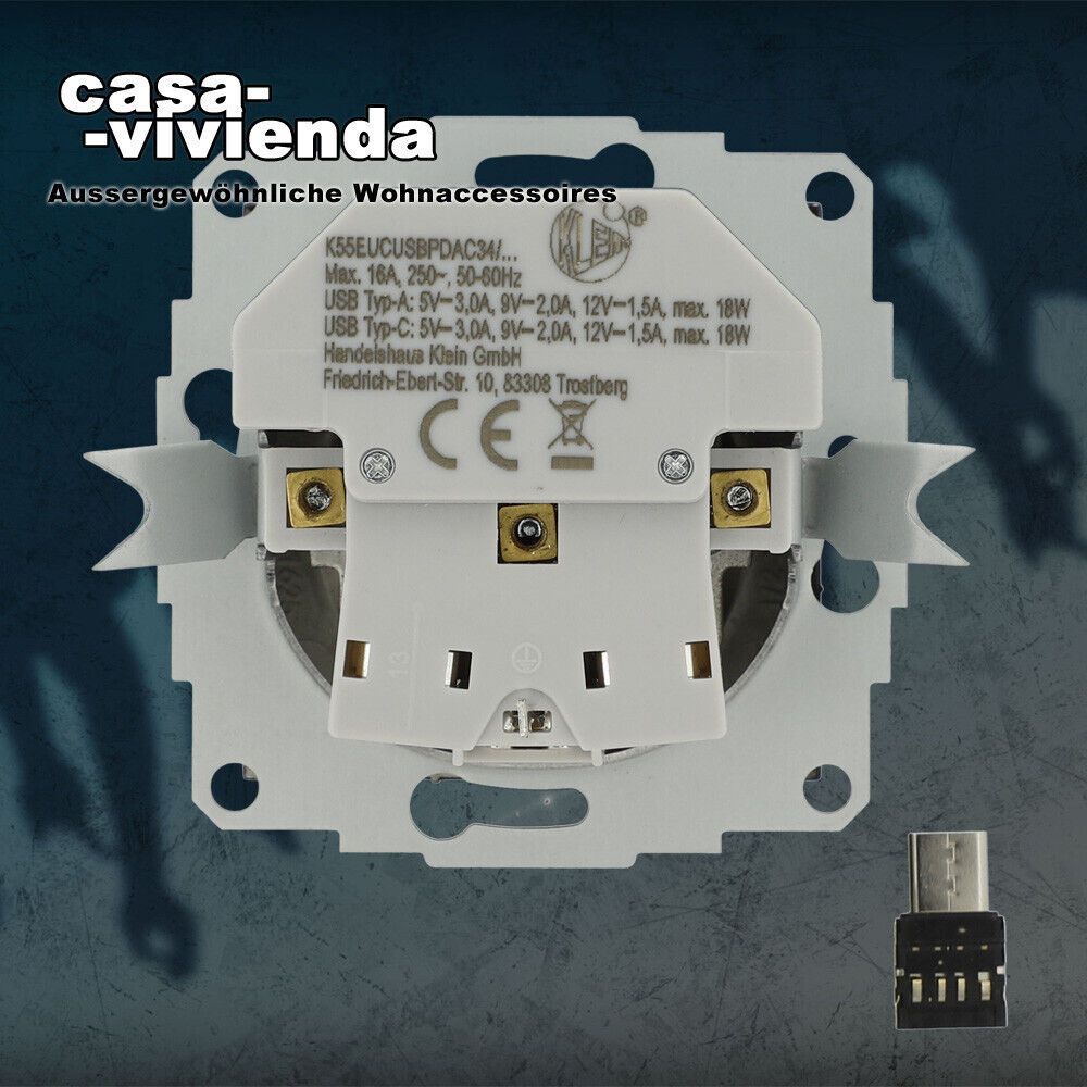 casavivienda Außergenwöhliche Wohnaccessoires ... ...anders als alle Anderen... Kombi-Steckdose mit 1x USBA, 1x USBC, PD Standard, 5V-3,4A 9V-2A 12V-1,5A 18V-1A, 18W 16 A 250 V mit Steckklemmen KLEIN ® K55® passend zu MERTEN® System M Reinweiß glänzend (RAL9010) - inklusive beiliegendem Adapter USBC