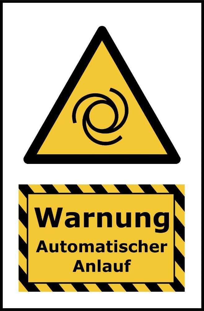Kombi-Warnschild Automatischer Anlauf Kunststoffplatte + Klebepads Euro-Norm 20x30cm