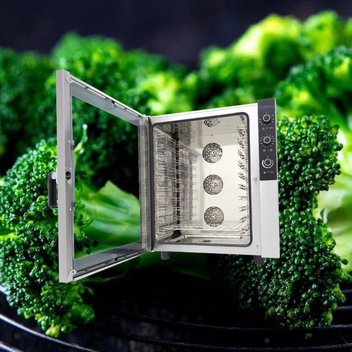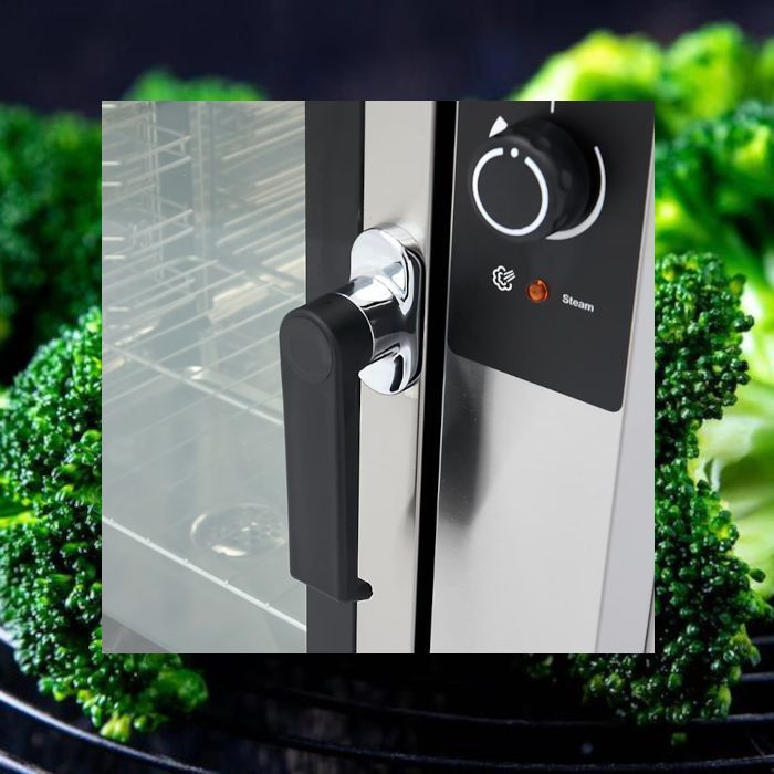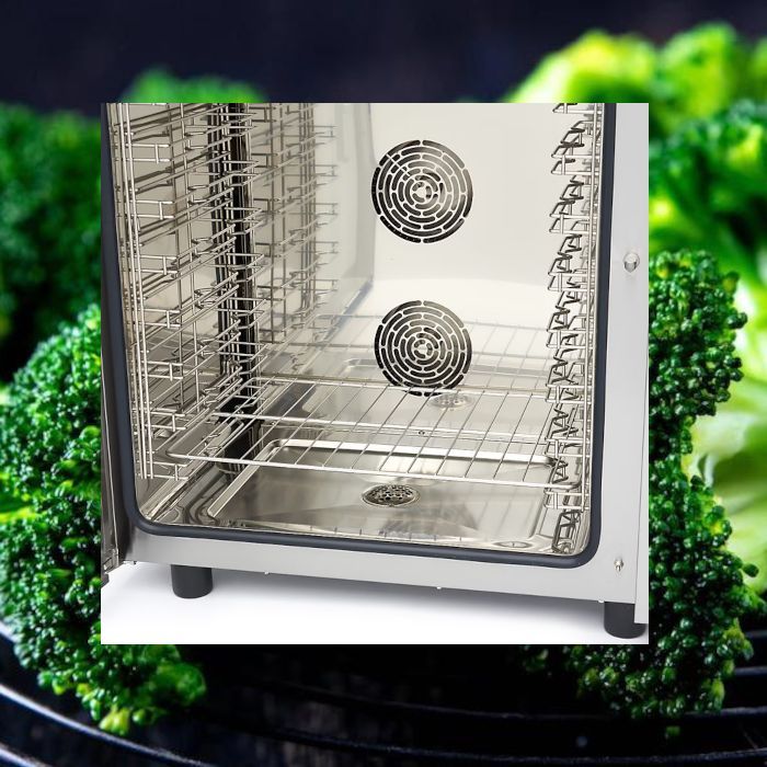 Kombidämpfer 10 x 1 1 Analog HERO24-10GN1A-EASY Analoge Steuerung kochen, backen und dämpfen komplett aus Edelstahl 10 Einschübe für GN 1 1 Behälter 530x325 mit Wasser- und Abwasseranschluss Betriebsspannung 400 Volt 11,8 KW B 810 x T 870 x H 1000 Umluftbetrieb Nettogewicht 105 kg Abstand der Tablet