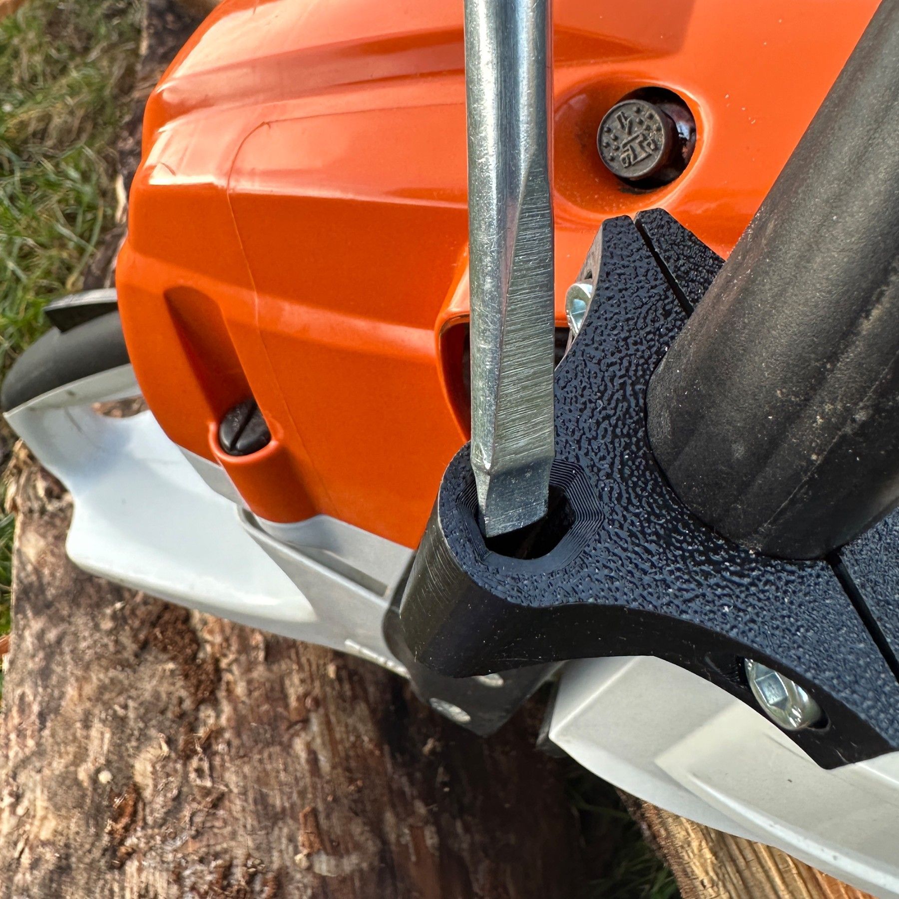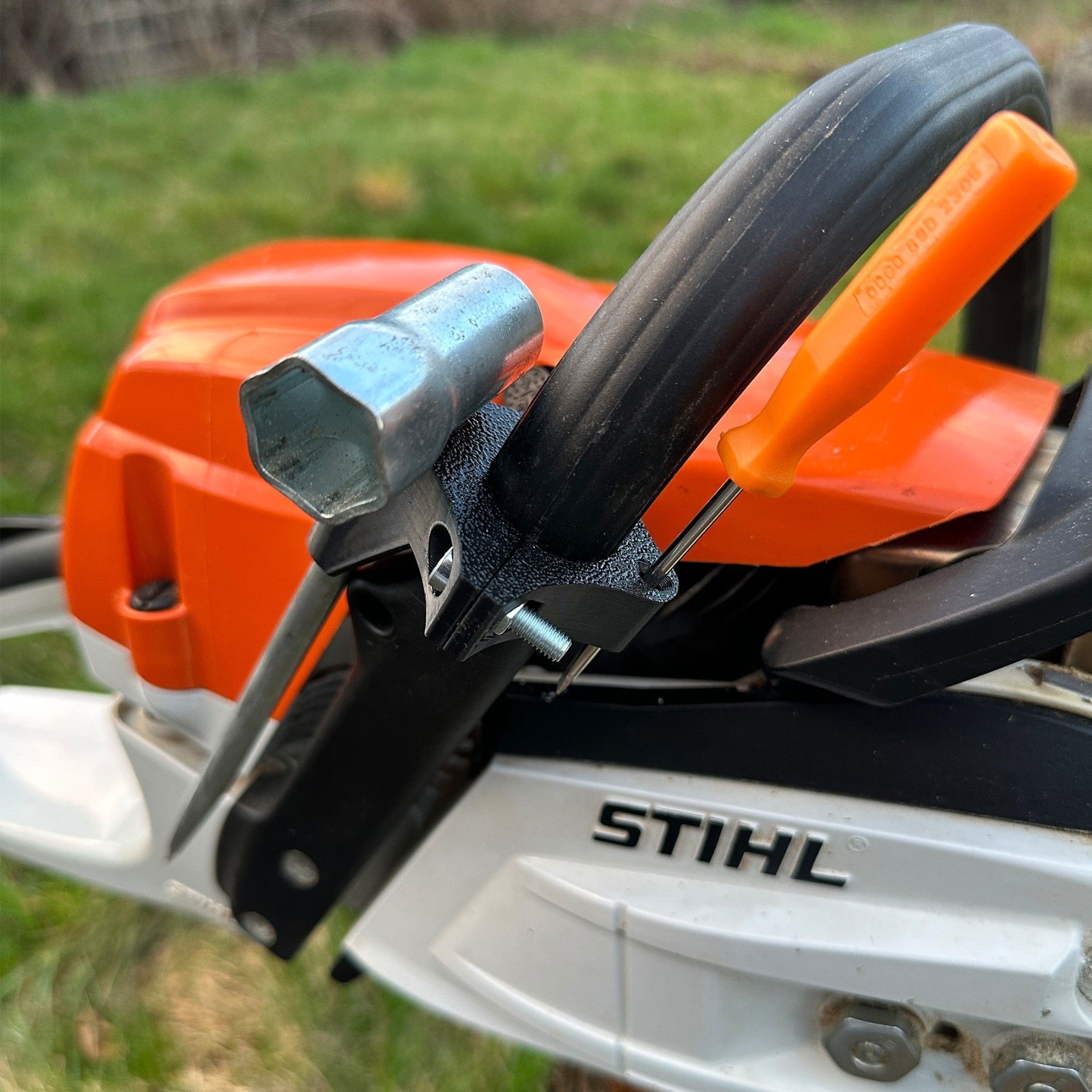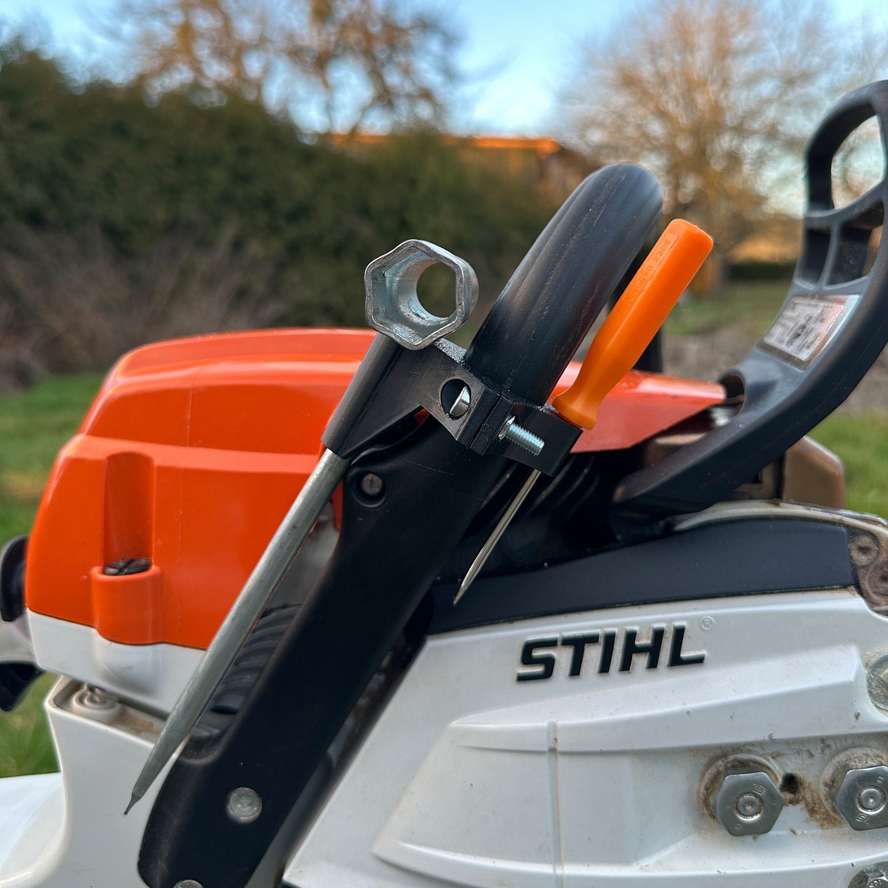 - Kombischlüsselhalter direkt an der Säge befestigen - Drehsicherung – kein herausfallen den Kombischlüssels - passend für alle Sägen mit rundem Standardgriff - für den Einsatz im Wald entwickelt