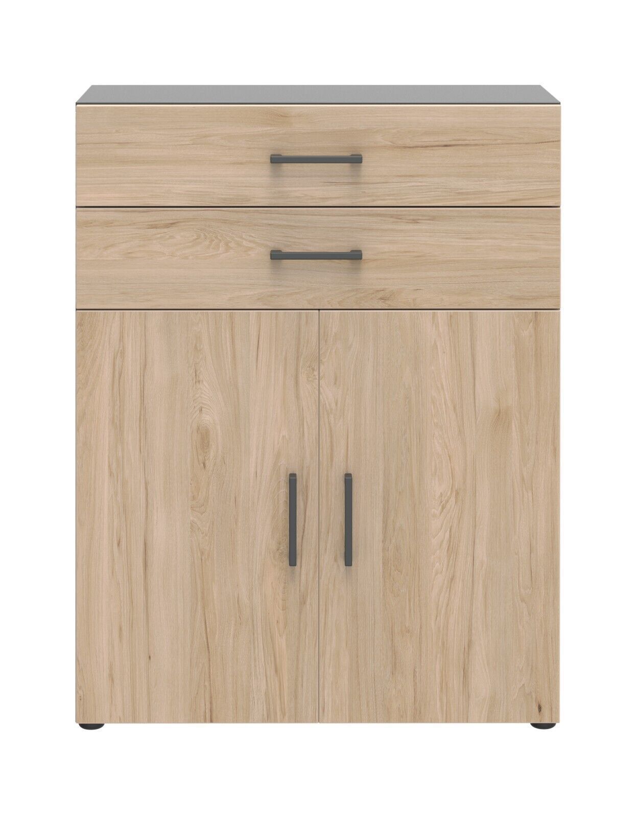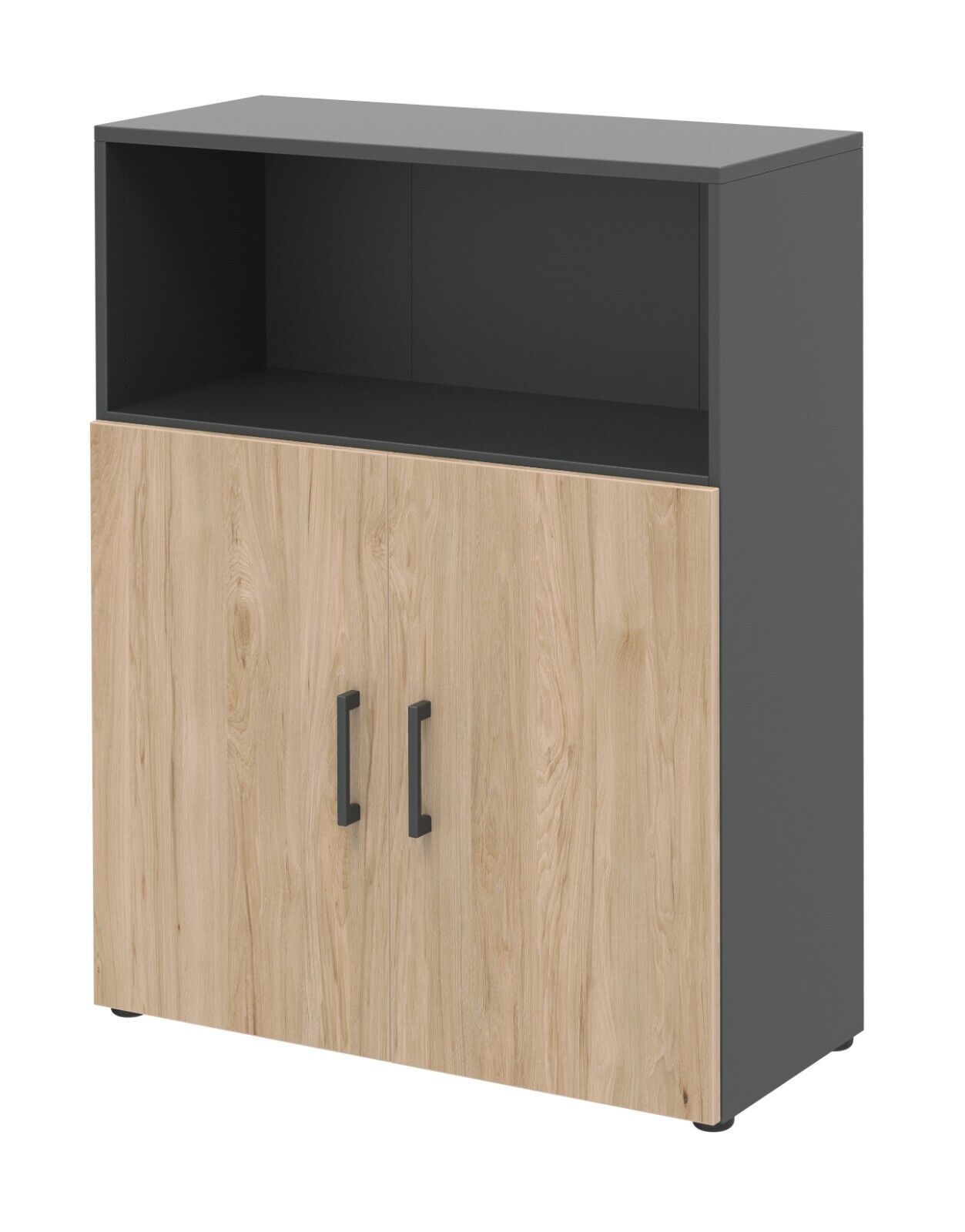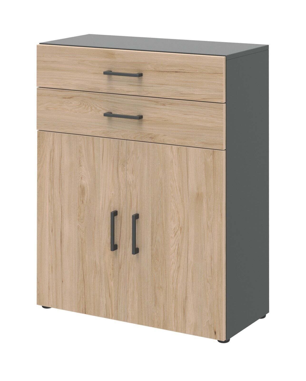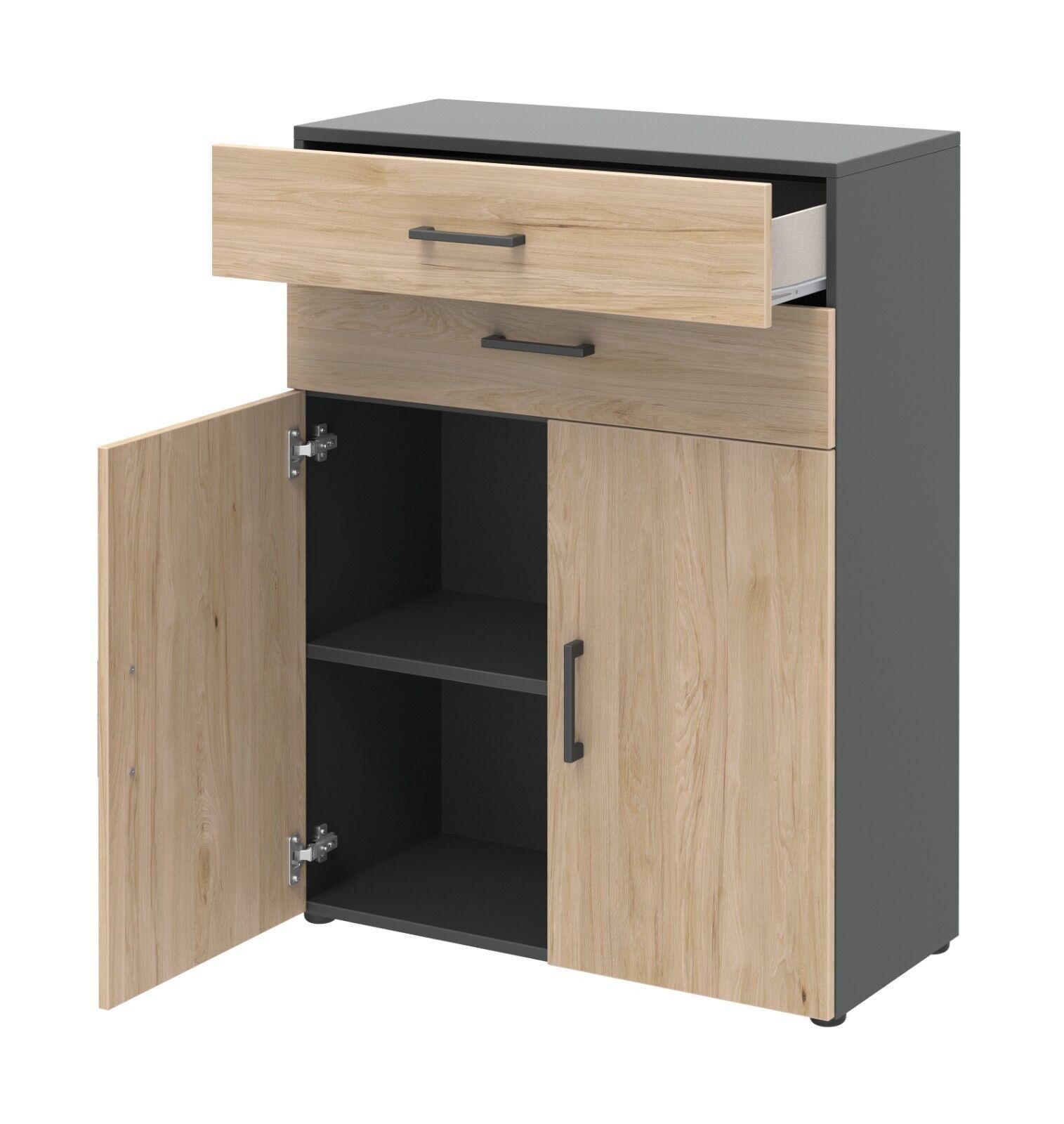 Kommode 3 Ordnerhöhen mit 2 Türen 2 Schubkästen Made in Germany Farbe: anthrazit Front Farbe Hickory Das zweitürige Highboard mit zwei Ablagen in Ordnerhöhe und -tiefe besitzt eine Schubkastenenheit mit zwei Schüben. Tipp: Die Einbau-Schubkästen müssen nicht montiert werden. Somit entsteht ein weite