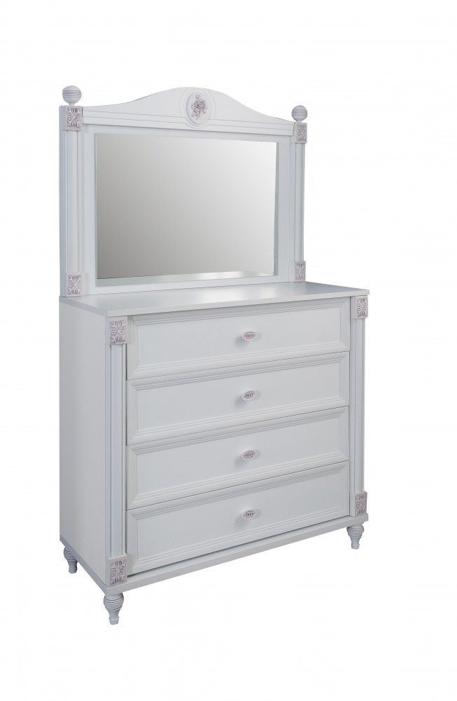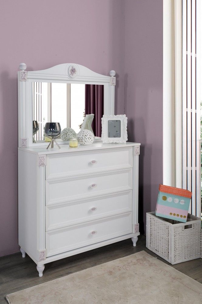 Kommode Goldi mit Schubkästen inklusive Spiegel GOL-WK 1x Kinderkommode Goldi B H T: ca. 99x97x43 cm Material: Spanplatte 4x große Schubladen 1x Spiegel Goldi B H T: ca. 99x75x22cm mit romantischen Verzierungen Die Ware wird zerlegt geliefert. Ohne Dekor und Textilien Optional erhältlich: Jedes Elem