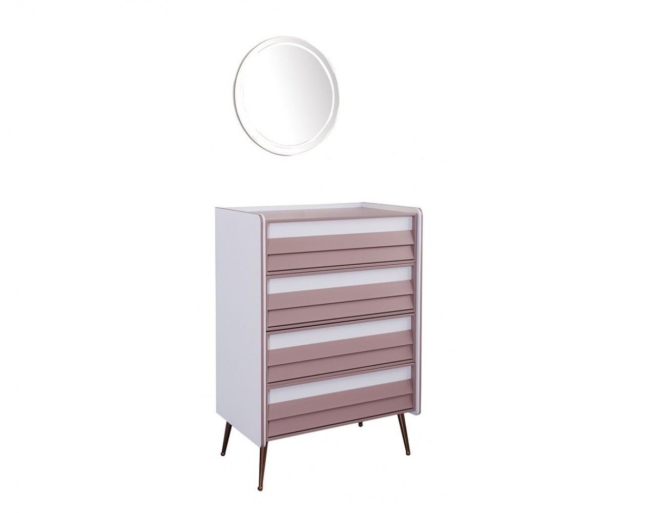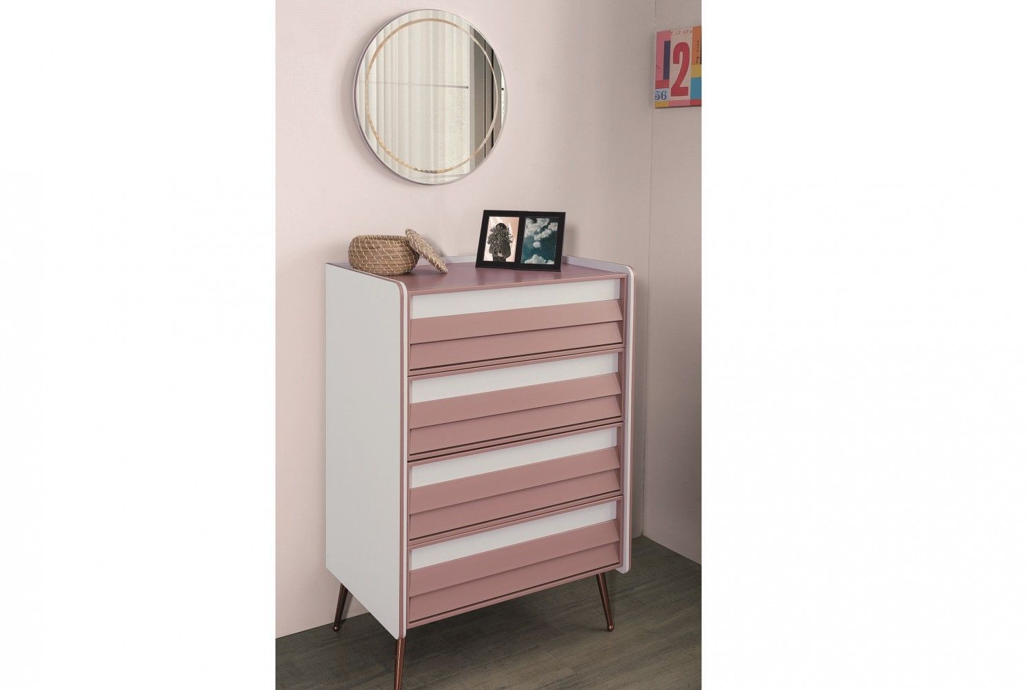 Kommode Rosee in weiss mit Spiegel WK-RE-1 Im Angebot enthalten: 1x Kommode Rosee B H T: ca. 60x43x46 cm MDF-Platte Abgerundete Kanten 4x Schubfach 4x Fuß Mit Softclose Mechanismus Die Ware wird zerlegt geliefert und muss montiert werden. Ohne Dekor und Textilien Optional erhältlich: 1x Spiegel Rund